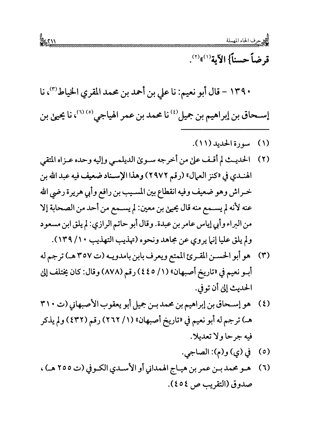 ١٣٩٠ - قال أبو نعيم: نا علي بن أحمد بن محمد المقري الخياط (¬٣)، نا إسحاق بن إبراهيم بن جميل (¬٤) نا محمد بن عمر الهياجي (¬٥) (¬٦)، نا يحيى بن