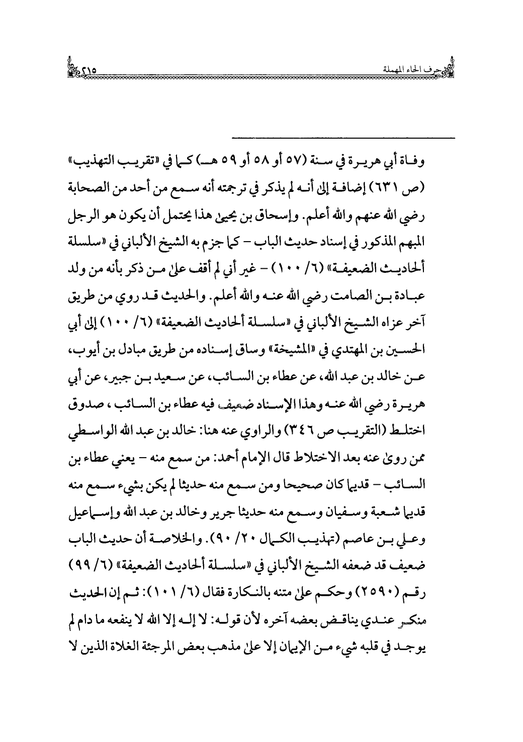 = وفاة أبي هريرة في سنة (٥٧ أو ٥٨ أو ٥٩ هـ) كما في "تقريب التهذيب" (ص ٦٣١) إضافة إلى أنه لم يذكر في ترجمته أنه سمع من أحد من الصحابة رضي الله عنهم والله أعلم. وإسحاق بن يحيى هذا يحتمل أن يكون هو الرجل المبهم المذكور في إسناد حديث الباب - كما جزم به الشيخ الألباني في "سلسلة الأحاديث الضعيفة" (٦/ ١٠٠) - غير أني لم أقف على من ذكر بأنه من ولد عبادة بن الصامت رضي الله عنه والله أعلم. والحديث قد روى من طريق آخر عزاه الشيخ الألباني في "سلسلة الأحاديث الضعيفة" (٦/ ١٠٠) إلى أبي الحسين بن المهتدي في "المشيخة" وساق إسناده من طريق مبادل بن أيوب، عن خالد بن عبد الله، عن عطاء بن السائب، عن سعيد بن جبير، عن أبي هريرة رضي الله عنه وهذا الإسناد ضعيف فيه عطاء بن السائب، صدوق اختلط (التقريب ص ٣٤٦) والراوي عنه هنا: خالد بن عبد الله الواسطي ممن روى عنه بعد الاختلاط قال الإمام أحمد: من سمع منه - يعني عطاء بن السائب - قديما كان صحيحا ومن سمع منه حديثا لم يكن بشيء سمع منه قديمًا شعبة وسفيان وسمع منه حديثا جرير وخالد بن عبد الله وإسماعيل وعلي بن عاصم (تهذيب الكمال ٢٠/ ٩٠). والخلاصة أن حديث الباب ضعيف قد ضعفه الشيخ الألباني في "سلسلة الأحاديث الضعيفة" (٦/ ٩٩) رقم (٢٥٩٠) وحكم على متنه بالنكارة فقال (٦/ ١٠١): ثم إن الحديث منكر عندي يناقض بعضه آخره لأن قوله: لا إله إلا الله لا ينفعه ما دام لم يوجد في قلبه شيء من الإيمان إلا على مذهب بعض المرجئة الغلاة الذين لا =