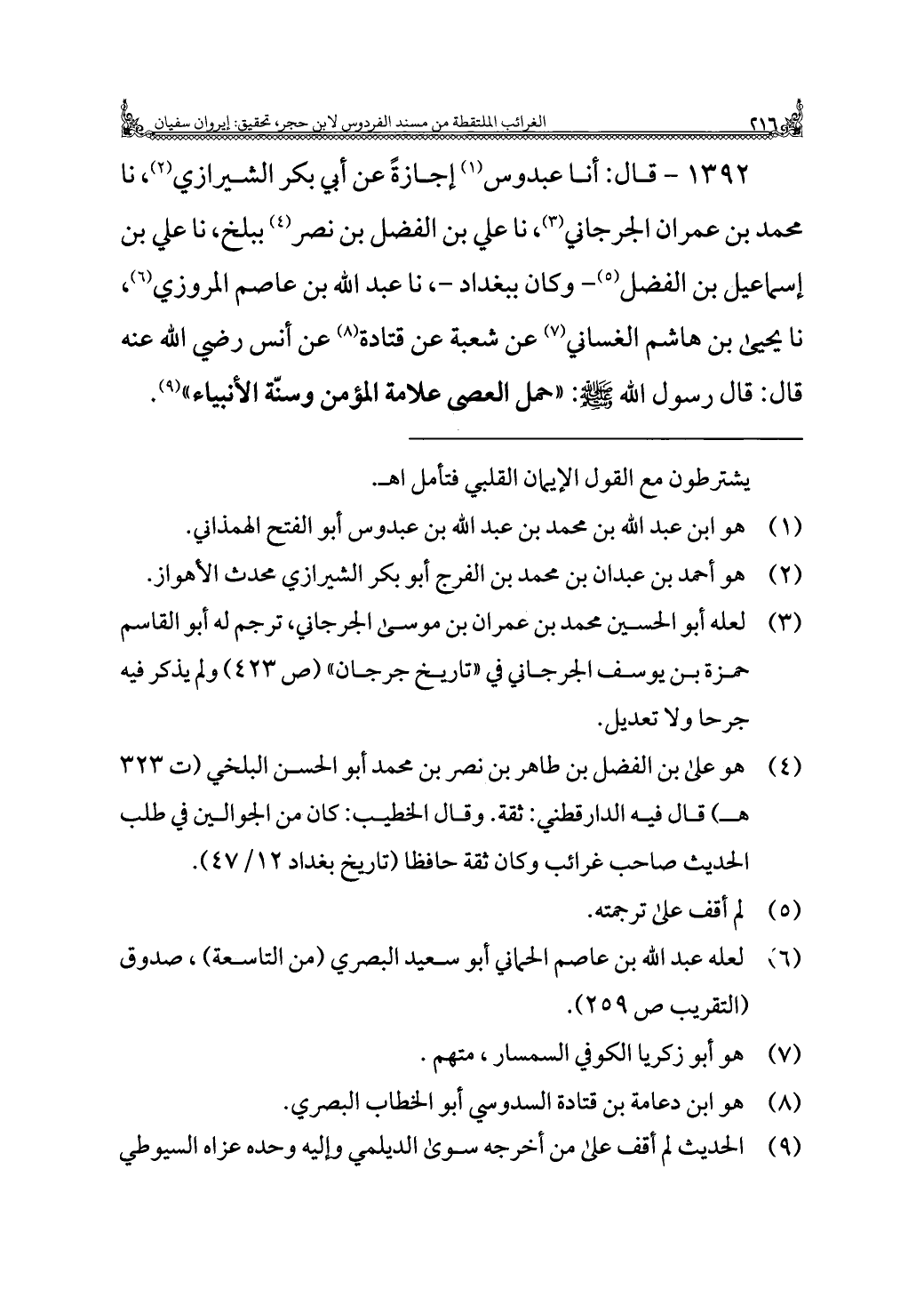 ١٣٩٢ - قال: أنا عبدوس (¬١) إجازةً عن أبي بكر الشيرازي (¬٢)، نا محمد بن عمران الجرجاني (¬٣)، نا علي بن الفضل بن نصر (¬٤) ببلخ، نا علي بن إسماعيل بن الفضل (¬٥) - وكان ببغداد -، نا عبد الله بن عاصم المروزي (¬٦)، نا يحيى بن هاشم الغساني (¬٧) عن شعبة عن قتادة (¬٨) عن أنس رضي الله عنه قال: قال رسول الله - صلى الله عليه وسلم -: "حمل العصى علامة المؤمن وسنّة الأنبياء" (¬٩).