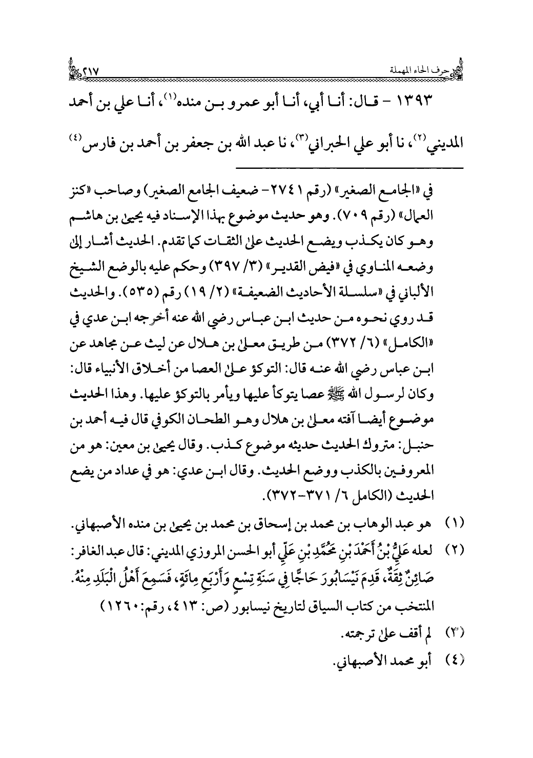 ١٣٩٣ - قال: أنا أبي، أنا أبو عمرو بن منده (¬١)، أنا علي بن أحمد المديني (¬٢)، نا أبو علي الحبراني (¬٣)، نا عبد الله بن جعفر بن أحمد بن فارس (¬٤)