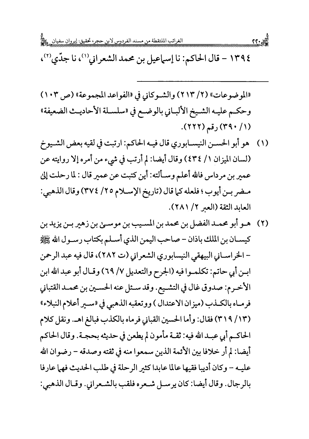 (¬٢) هو أبو محمد الفضل بن محمد بن المسيب بن موسى بن زهير بن يزيد بن كيسان بن الملك باذان - صاحب اليمن الذي أسلم بكتاب رسول الله - صلى الله عليه وسلم - الخراساني البيهقي النيسابوري الشعراني (ت ٢٨٢)، قال فيه عبد الرحمن بن أبي حاتم: تكلموا فيه (الجرح والتعديل ٧/ ٦٩) وقال أبو عبد الله ابن الأخرم: صدوق غال في التشيع. وقد سئل عنه الحسين بن محمد القتباني فرماه بالكذب (ميزان الاعتدال) ووتعقبه الذهبي في "سير أعلام النبلاء" (١٣/ ٣١٩) فقال: وأما الحسين القباني فرماه بالكذب فبالغ اهـ. ونقل كلام الحاكم أبي عبد الله فيه: ثقة مأمون لم يطعن في حديثه بحجة. وقال الحاكم أيضًا: لم أر خلافا بين الأئمة الذين سمعوا منه في ثقته وصدقه - رضوان الله عليه - وكان أديبا فقيها عالمًا عابدا كثير الرحلة في طلب الحديث فهما عارفا بالرجال. وقال أيضًا: كان يرسل شعره فلقب بالشعراني. وقال الذهبي: =