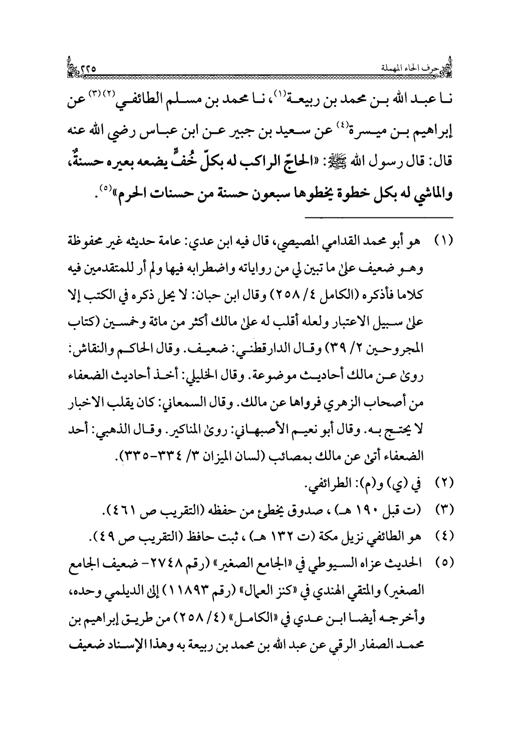 نا عبد الله بن محمد بن ربيعة (¬١)، نا محمد بن مسلم الطائفي (¬٢) (¬٣) عن إبراهيم بن ميسرة (¬٤) عن سعيد بن جبير عن ابن عباس رضي الله عنه قال: قال رسول الله - صلى الله عليه وسلم -: "الحاجّ الراكب له بكلّ خُفٍّ يضعه بعيره حسنةٌ، والماشي له بكل خطوة يخطوها سبعون حسنة من حسنات الحرم" (¬٥).