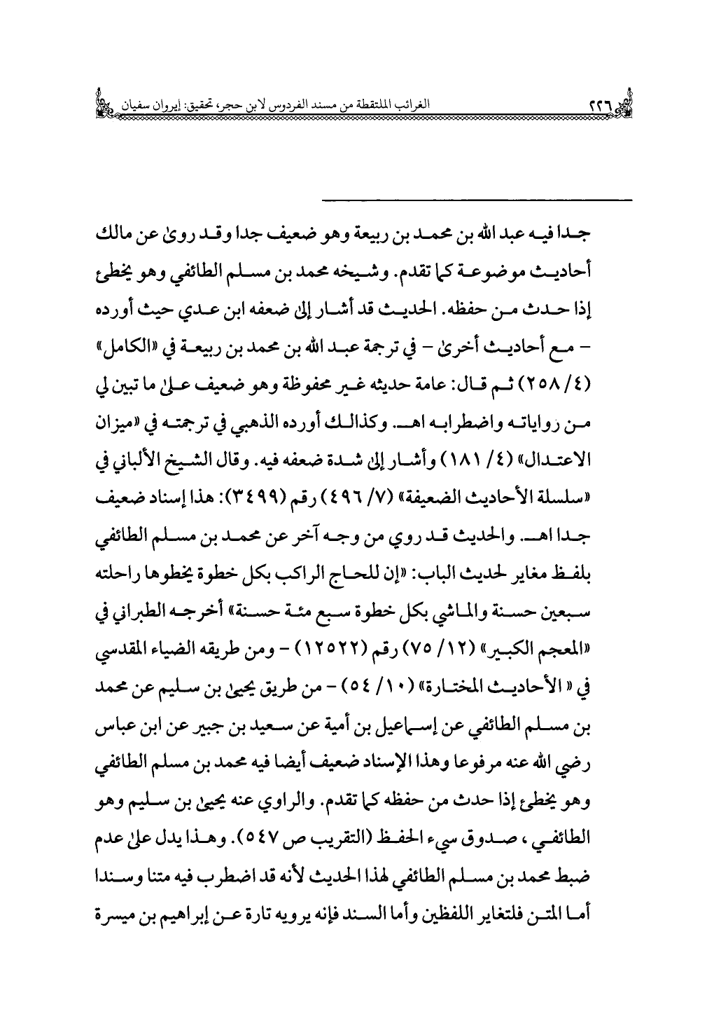 = جدًا فيه عبد الله بن محمد بن ربيعة وهو ضعيف جدًا وقد روى عن مالك أحاديث موضوعة كما تقدم. وشيخه محمد بن مسلم الطائفي وهو يخطئ إذا حدث من حفظه. الحديث قد أشار إلى ضعفه ابن عدي حيث أورده - مع أحاديث أخرى - في ترجمة عبد الله بن محمد بن ربيعة في "الكامل" (٤/ ٢٥٨) ثم قال: عامة حديثه غير محفوظة وهو ضعيف على ما تبين لي من رواياته واضطرابه اهـ. وكذلك أورده الذهبي في ترجمته في "ميزان الاعتدال" (٤/ ١٨١) وأشار إلى شدة ضعفه فيه. وقال الشيخ الألباني في "سلسلة الأحاديث الضعيفة" (٧/ ٤٩٦) رقم (٣٤٩٩): هذا إسناد ضعيف جدًا اهـ. والحديث قد روى من وجه آخر عن محمد بن مسلم الطائفي بلفظ مغاير لحديث الباب: "إن للحاج الراكب بكل خطوة يخطوها راحلته سبعين حسنة والماشي بكل خطوة سبع مئة حسنة" أخرجه الطبراني في "المعجم الكبير" (١٢/ ٧٥) رقم (١٢٥٢٢) - ومن طريقه الضياء المقدسي في "الأحاديث المختارة" (١٠/ ٥٤) - من طريق يحيى بن سليم عن محمد بن مسلم الطائفي عن إسماعيل بن أمية عن سعيد بن جبير عن ابن عباس رضي الله عنه مرفوعًا وهذا الإسناد ضعيف أيضًا فيه محمد بن مسلم الطائفي وهو يخطئ إذا حدث من حفظه كما تقدم. والراوي عنه يحيى بن سليم وهو الطائفي، صدوق سيء الحفظ (التقريب ص ٥٤٧). وهذا يدل على عدم ضبط محمد بن مسلم الطائفي لهذا الحديث لأنه قد اضطرب فيه متنا وسندا أما المتن فلتغاير اللفظين وأما السند فإنه يرويه تارة عن إبراهيم بن ميسرة =