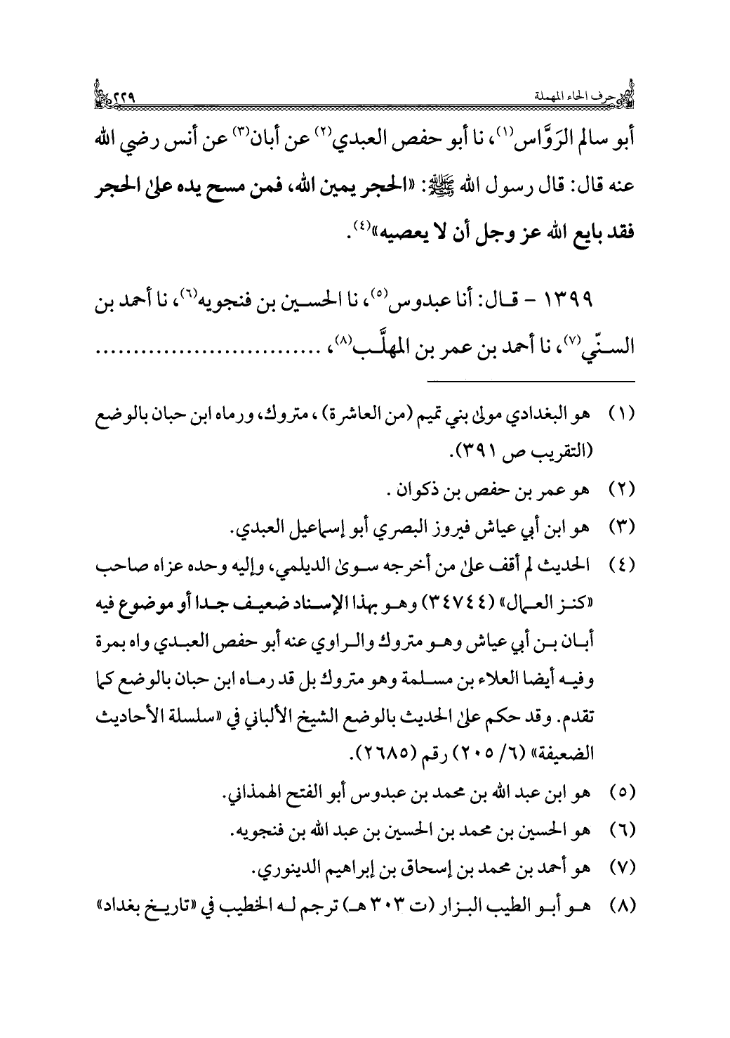 أبو سالم الرَوَّاس (¬١)، نا أبو حفص العبدي (¬٢) عن أبان (¬٣) عن أنس رضي الله عنه قال: قال رسول الله - صلى الله عليه وسلم -: "الحجر يمين الله، فمن مسح يده على الحجر فقد بايع الله عز وجل أن لا يعصيه" (¬٤).