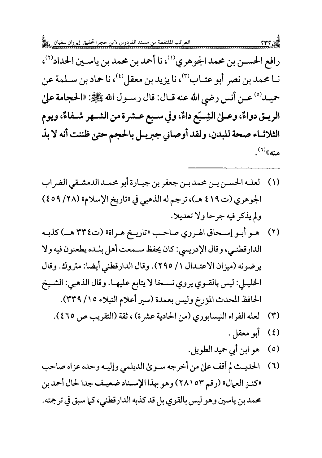 رافع الحسن بن محمد الجوهري (¬١)، نا أحمد بن محمد بن ياسين الحداد (¬٢)، نا محمد بن نصر أبو عتاب (¬٣)، نا يزيد بن معقل (¬٤)، نا حماد بن سلمة عن حميد (¬٥) عن أنس رضي الله عنه قال: قال رسول الله - صلى الله عليه وسلم -: "الحجامة على الريق دواءٌ، وعلى الشِبَع داءٌ، وفي سبع عشرة من الشهر شفاءٌ، ويوم الثلاثاء صحة للبدن، ولقد أوصاني جبريل بالحجم حتى ظننت أنه لا بدّ منه" (¬٦).