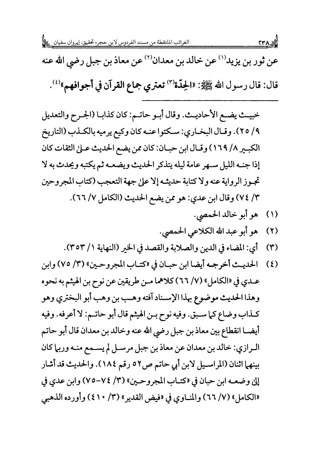(¬٤) الحديث أخرجه أيضًا ابن حبان في "كتاب المجروحين" (٣/ ٧٥) وابن عدي في "الكامل" (٧/ ٦٦) كلاهما من طريقين عن نوح بن الهيثم به نحوه وهذا الحديث موضوع بهذا الإسناد آفته وهب بن وهب أبو البختري وهو كذاب وضاع كما سبق. وفيه نوح بن الهيثم قال أبو حاتم: لا أعرفه. وفيه أيضًا انقطاع بين معاذ بن جبل رضي الله عنه وخالد بن معدان قال أبو حاتم الرازي: خالد بن معدان عن معاذ بن جبل مرسل لم يسمع منه وربما كان بينهما اثنان (المراسيل لابن أبي حاتم ص ٥٢ رقم ١٨٤). والحديث قد أشار إلى وضعه ابن حبان في "كتاب المجروحين" (٣/ ٧٤ - ٧٥) وابن عدي في "الكامل" (٧/ ٦٦) والمناوي في "فيض القدير" (٣/ ٤١٠) وأورده الذهبي =