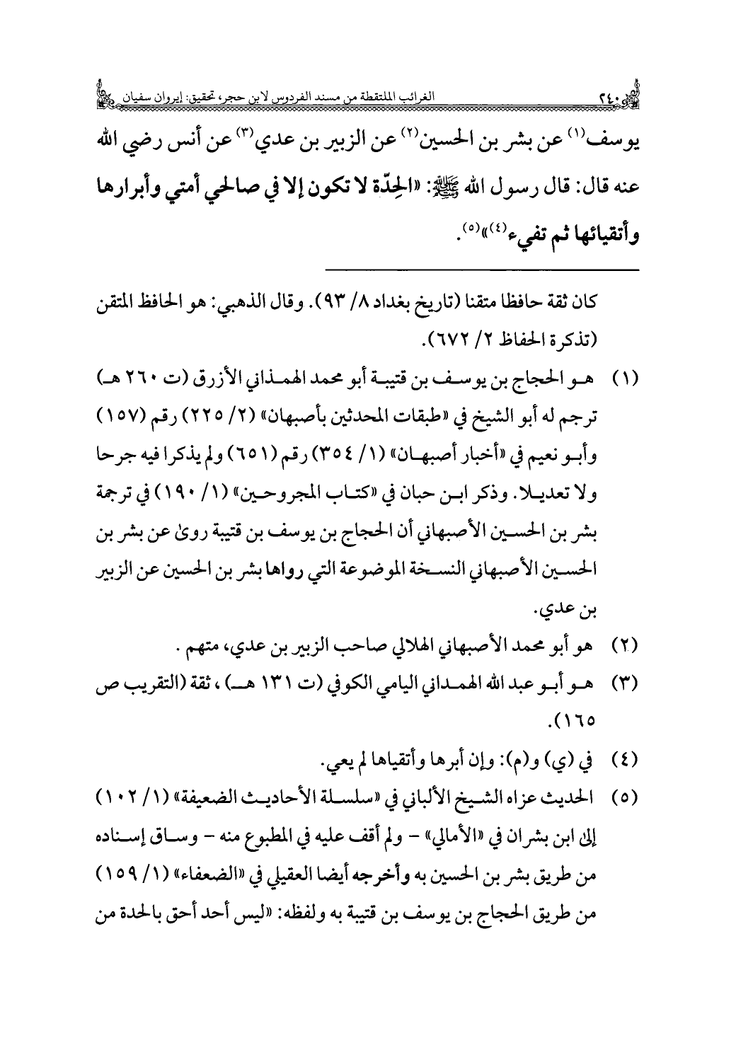 (¬١) هو الحجاج بن يوسف بن قتيبة أبو محمد الهمذاني الأزرق (ت ٢٦٠ هـ) ترجم له أبو الشيخ في "طبقات المحدثين بأصبهان" (٢/ ٢٢٥) رقم (١٥٧) وأبو نعيم في "أخبار أصبهان" (١/ ٣٥٤) رقم (٦٥١) ولم يذكرا فيه جرحًا ولا تعديلًا. وذكر ابن حبان في "كتاب المجروحين" (١/ ١٩٠) في ترجمة بشر بن الحسين الأصبهاني أن الحجاج بن يوسف بن قتيبة روى عن بشر بن الحسين الأصبهاني النسخة الموضوعة التي رواها بشر بن الحسين عن الزبير بن عدي.