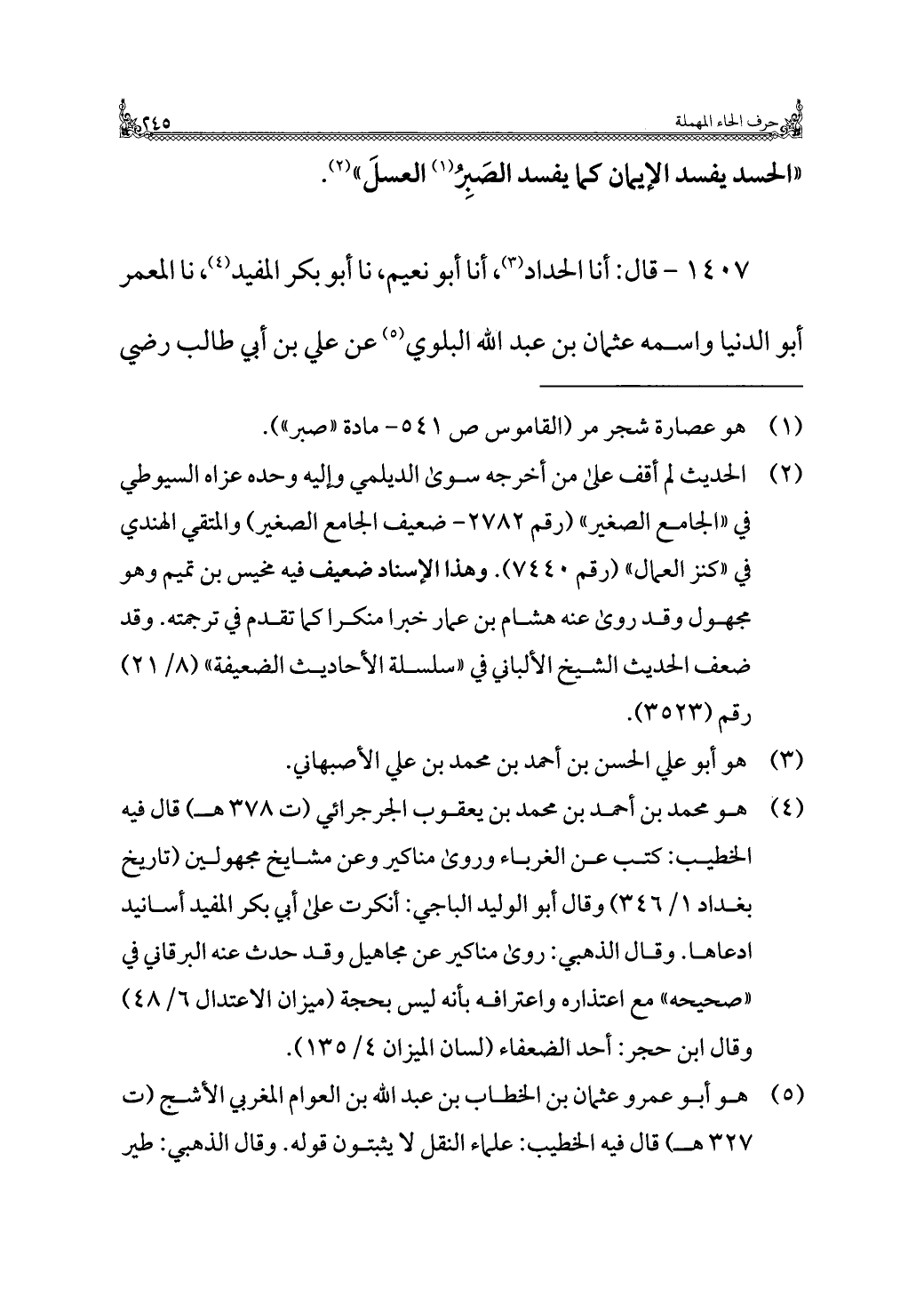 ١٤٠٧ - قال: أنا الحداد (¬٣)، أنا أبو نعيم، نا أبو بكر المفيد (¬٤)، نا المعمر أبو الدنيا واسمه عثمان بن عبد الله البلوي (¬٥) عن علي بن أبي طالب رضي