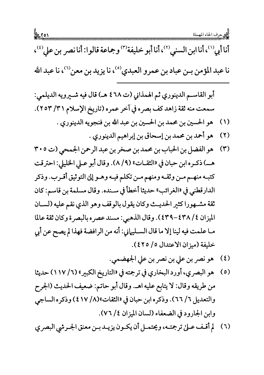 (¬٣) هو الفضل بن الحباب بن محمد بن صخر بن عبد الرحمن الجمحي (ت ٣٠٥ هـ) ذكره ابن حبان في "الثقات" (٩/ ٨). وقال أبو علي الخليلي: احترقت كتبه منهم من وثقه ومنهم من تكلم فيه وهو إلى التوثيق أقرب. وذكر الدارقطني في "الغرائب" حديثا أخطأ في سنده. وقال مسلمة بن قاسم: كان ثقة مشهورا كثير الحديث وكان يقول بالوقف وهو الذي نقم عليه (لسان الميزان ٤/ ٤٣٨ - ٤٣٩). وقال الذهبي: مسند عصره بالبصرة وكان ثقة عالما ما علمت فيه لينا إلا ما قال السليماني: أنه من الرافضة فهذا لم يصح عن أبي خليفة (ميزان الاعتدال ٥/ ٤٢٥).
