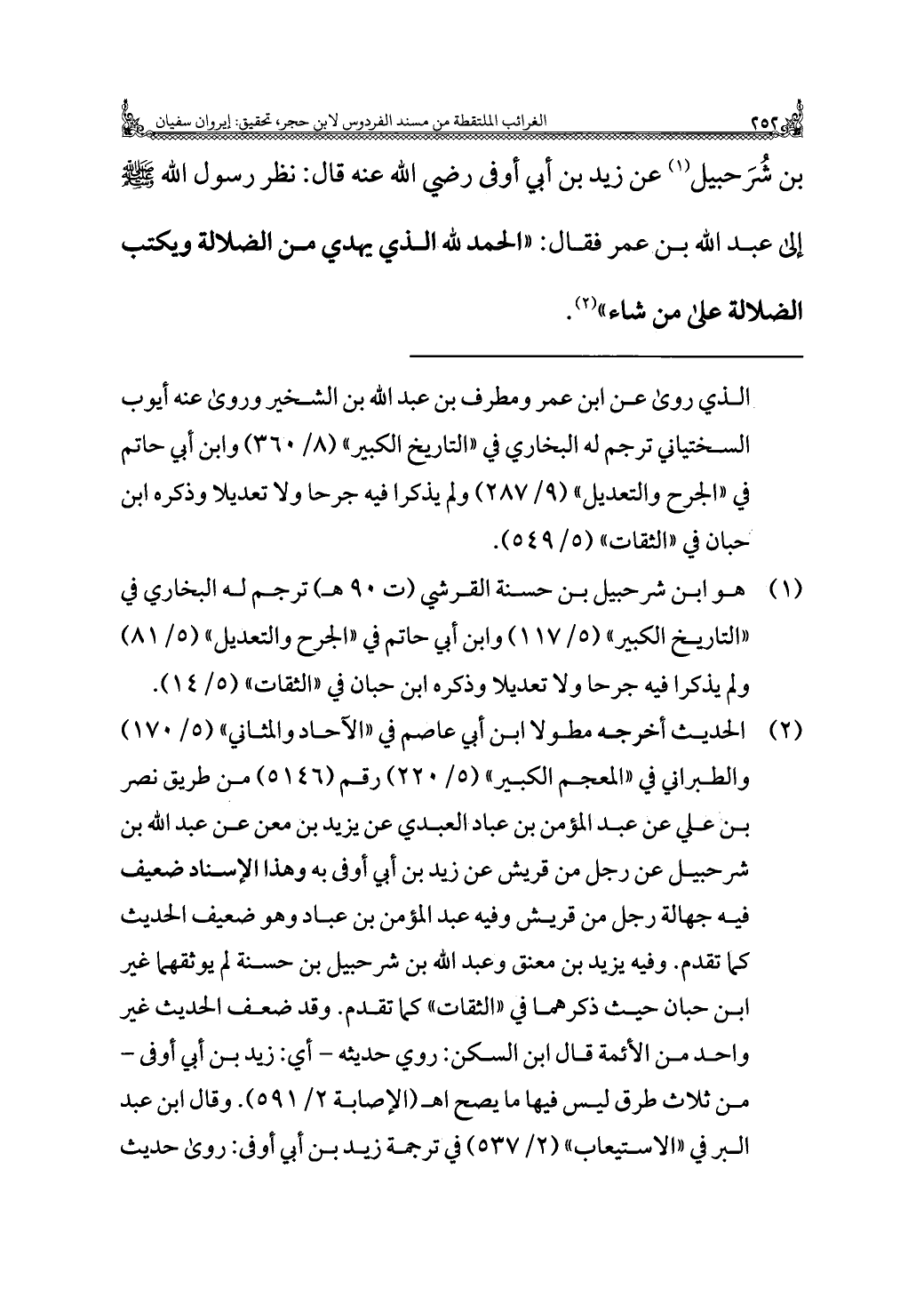 بن شُرَحبيل (¬١) عن زيد بن أبي أوفى رضي الله عنه قال: نظر رسول الله - صلى الله عليه وسلم - إلى عبد الله بن عمر فقال: "الحمد لله الذي يهدي من الضلالة ويكتب الضلالة على من شاء" (¬٢).