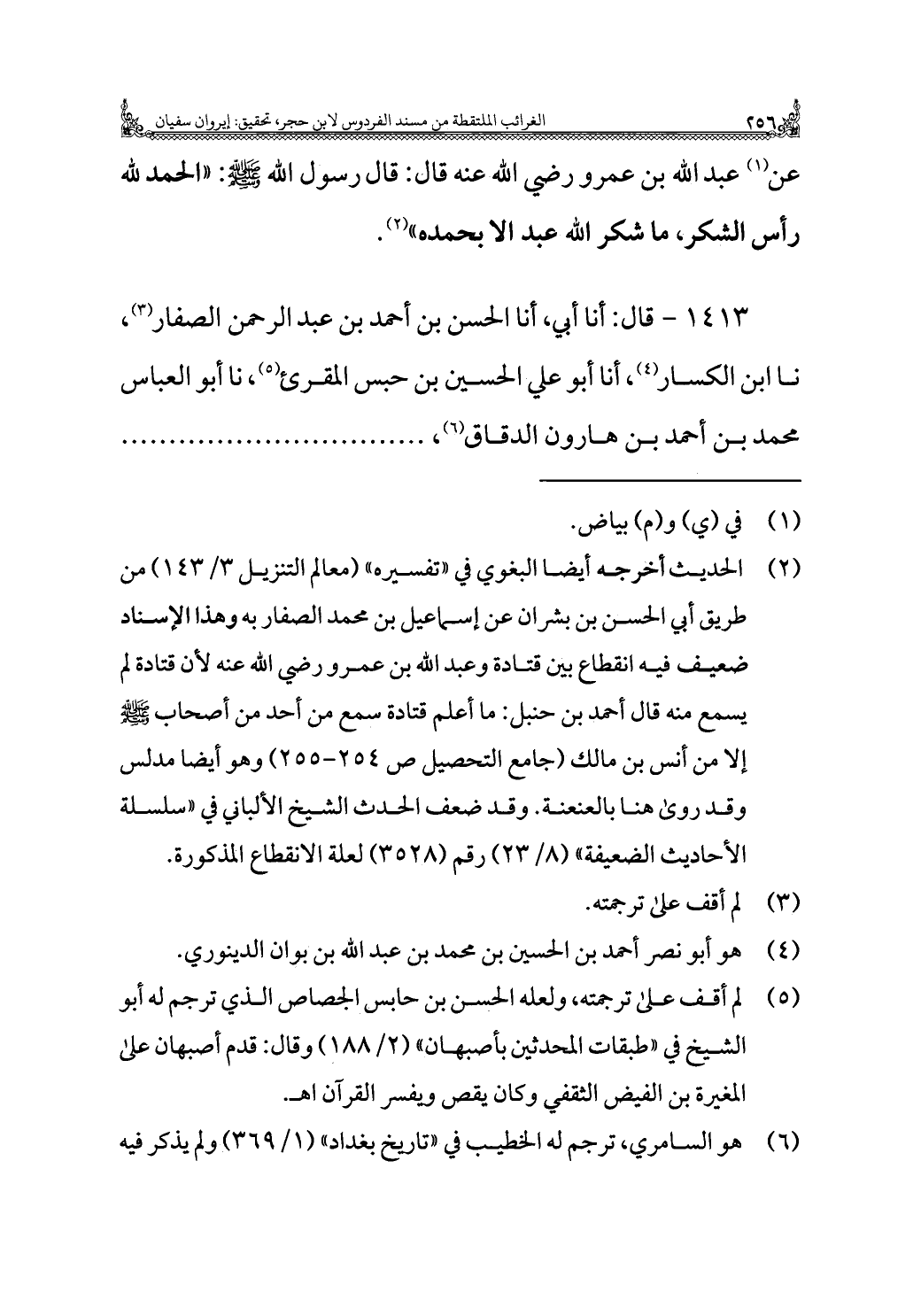 ١٤١٣ - قال: أنا أبي، أنا الحسن بن أحمد بن عبد الرحمن الصفار (¬٣)، نا ابن الكسار (¬٤)، أنا أبو علي الحسين بن حبس المقرئ (¬٥)، نا أبو العباس محمد بن أحمد بن هارون الدقاق (¬٦)، . . . . . . . . . . . . .