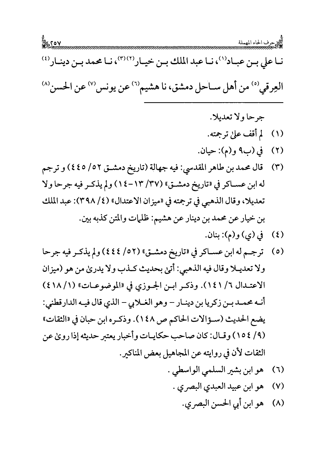 (¬٣) قال محمد بن طاهر المقدسي: فيه جهالة (تاريخ دمشق ٥٢/ ٤٤٥) وترجم له ابن عساكر في "تاريخ دمشق" (٣٧/ ١٣ - ١٤) ولم يذكر فيه جرحًا ولا تعديلًا، وقال الذهبي في ترجمته في "ميزان الاعتدال" (٤/ ٣٩٨): عبد الملك بن خيار عن محمد بن دينار عن هشيم: ظلمات والمتن كذبه بين.