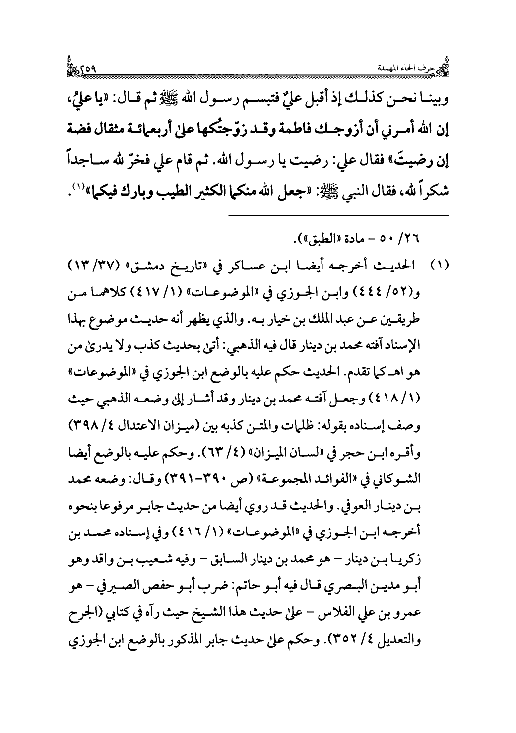 وبينا نحن كذلك إذ أقبل عليٌ فتبسم رسول الله - صلى الله عليه وسلم - ثم قال: "يا عليُ، إن الله أمرني أن أزوجك فاطمة وقد زوّجتُكها على أربعمائة مثقال فضة إن رضيتَ" فقال علي: رضيت يا رسول الله. ثم قام علي فخرّ لله ساجدًا شكرًا لله، فقال النبي - صلى الله عليه وسلم -: "جعل الله منكما الكثير الطيب وبارك فيكما" (¬١).