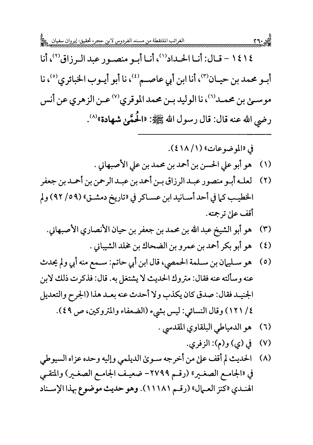 ١٤١٤ - قال: أنا الحداد (¬١)، أنا أبو منصور عبد الرزاق (¬٢)، أنا أبو محمد بن حيان (¬٣)، أنا ابن أبي عاصم (¬٤)، نا أبو أيوب الخبائري (¬٥)، نا موسى بن محمد (¬٦)، نا الوليد بن محمد الموقري (¬٧) عن الزهري عن أنس رضي الله عنه قال: قال رسول الله - صلى الله عليه وسلم -: "الحُمَّى شهادة" (¬٨).