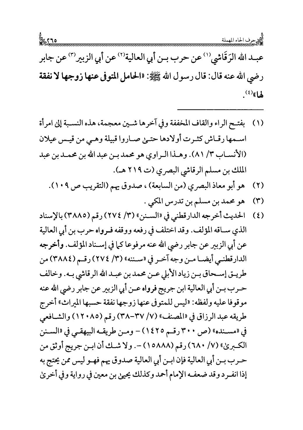 عبد الله الرَقَاشي (¬١) عن حرب بن أبي العالية (¬٢) عن أبي الزبير (¬٣) عن جابر رضي الله عنه قال: قال رسول الله - صلى الله عليه وسلم -: "الحامل المتوفى عنها زوجها لا نفقة لها" (¬٤).
