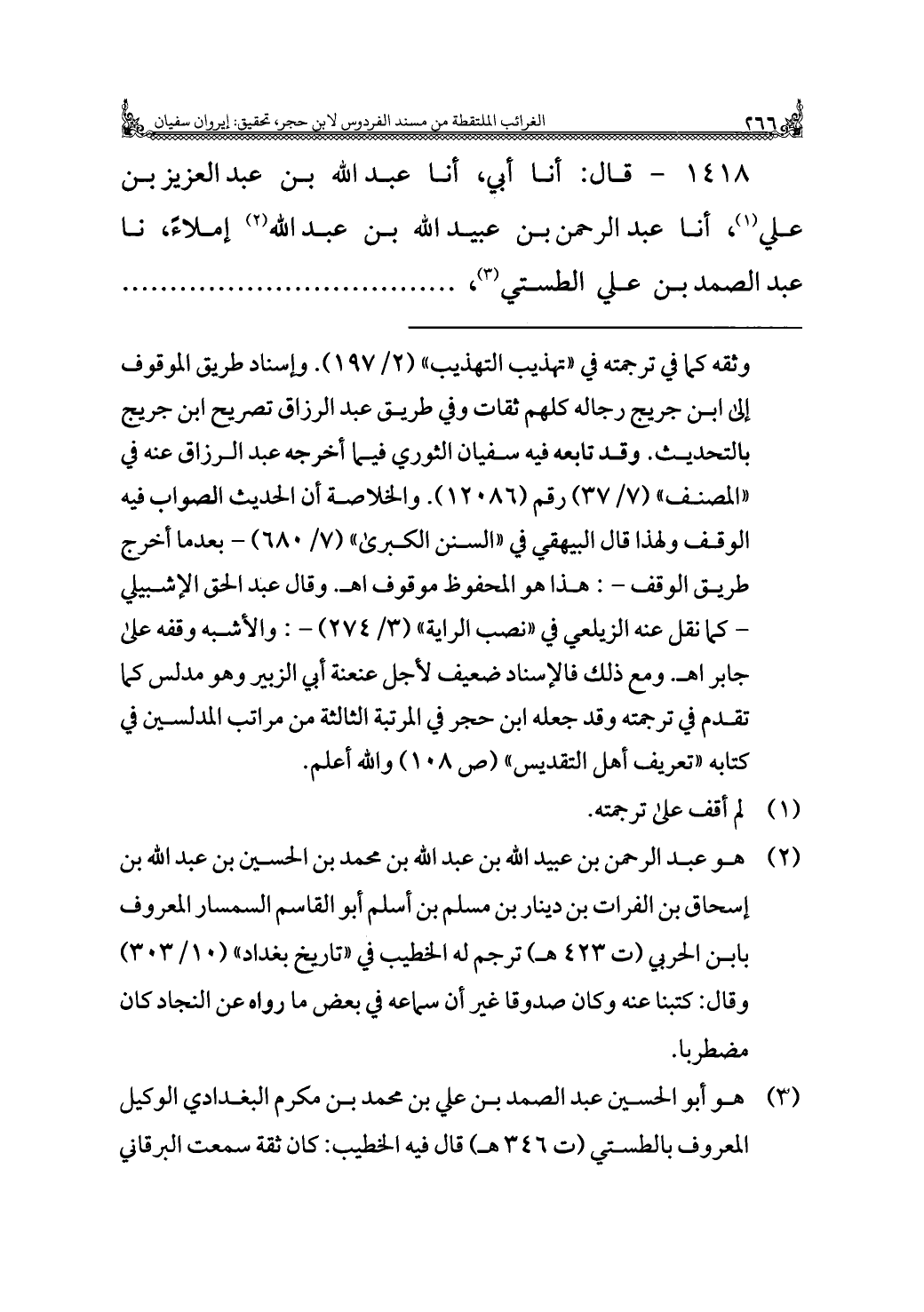 ١٤١٨ - قال: أنا أبي، أنا عبد الله بن عبد العزيز بن علي (¬١)، أنا عبد الرحمن بن عبيد الله بن عبد الله (¬٢) إملاءً، نا عبد الصمد بن علي الطستي (¬٣)، . . . . . . . . . . . . .