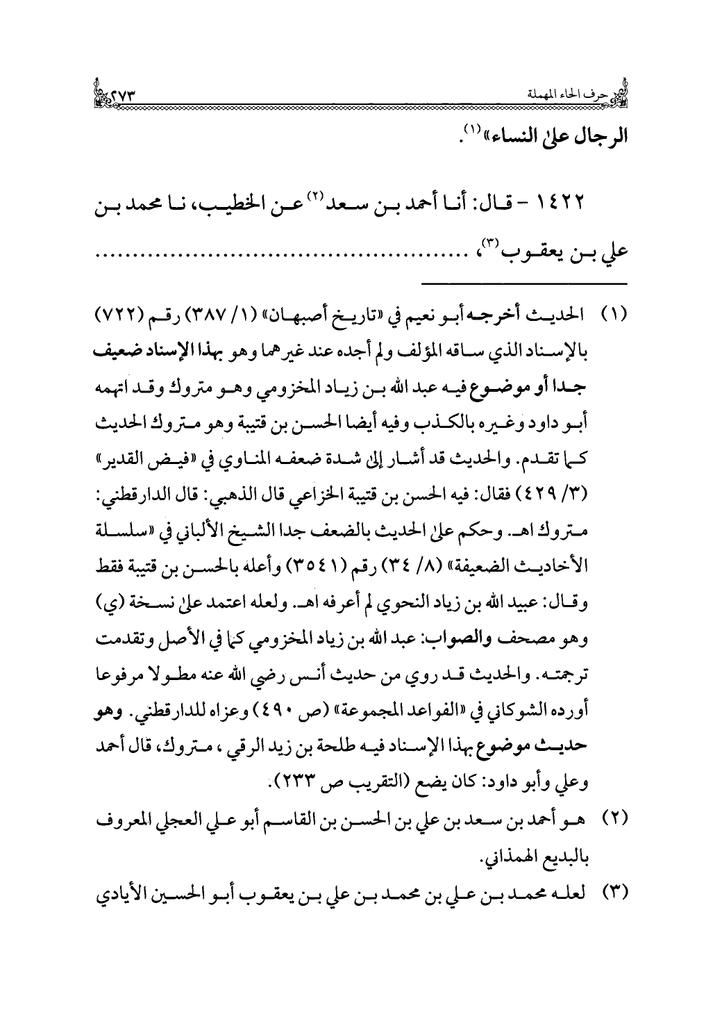 ١٤٢٢ - قال: أنا أحمد بن سعد (¬٢) عن الخطيب، نا محمد بن علي بن يعقوب (¬٣)، . . . . . . . . . . . . .