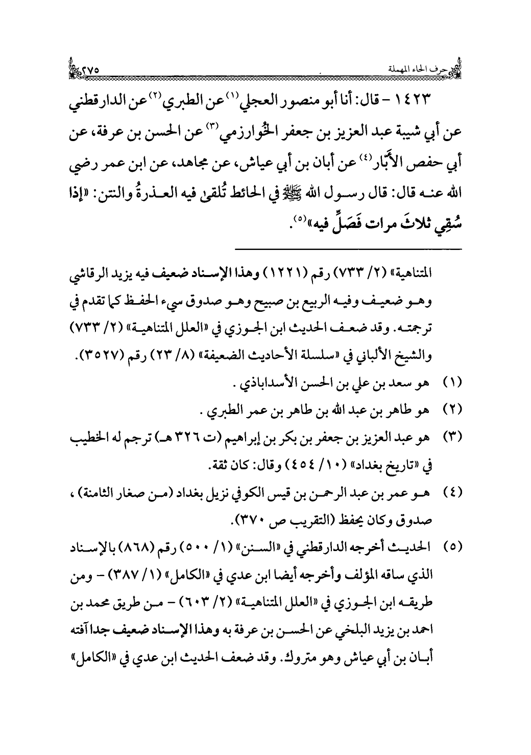 ١٤٢٣ - قال: أنا أبو منصور العجلي (¬١) عن الطبري (¬٢) عن الدارقطني عن أبي شيبة عبد العزيز بن جعفر الخُوارزمي (¬٣) عن الحسن بن عرفة، عن أبي حفص الأَبّار (¬٤) عن أبان بن أبي عياش، عن مجاهد، عن ابن عمر رضي الله عنه قال: قال رسول الله - صلى الله عليه وسلم - في الحائط تُلقى فيه العذرةُ والنتن: "إذا سُقِي ثلاثَ مرات فَصَلِّ فيه" (¬٥).