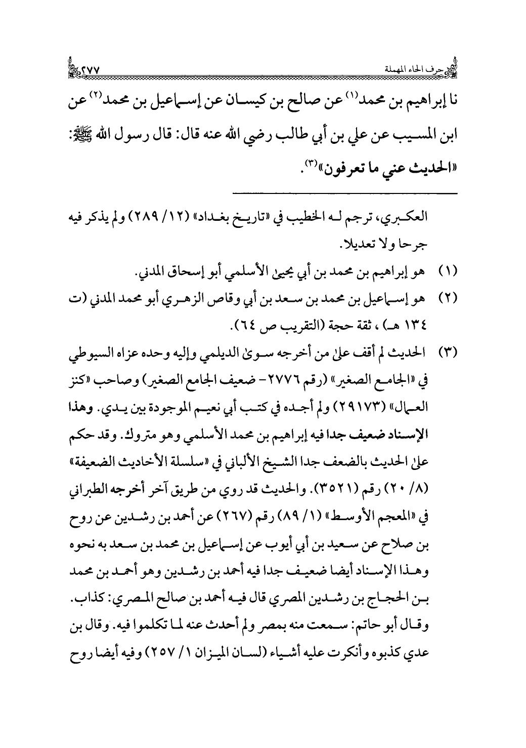 نا إبراهيم بن محمد (¬١) عن صالح بن كيسان عن إسماعيل بن محمد (¬٢) عن ابن المسيب عن علي بن أبي طالب رضي الله عنه قال: قال رسول الله - صلى الله عليه وسلم -: "الحديث عني ما تعرفون" (¬٣).