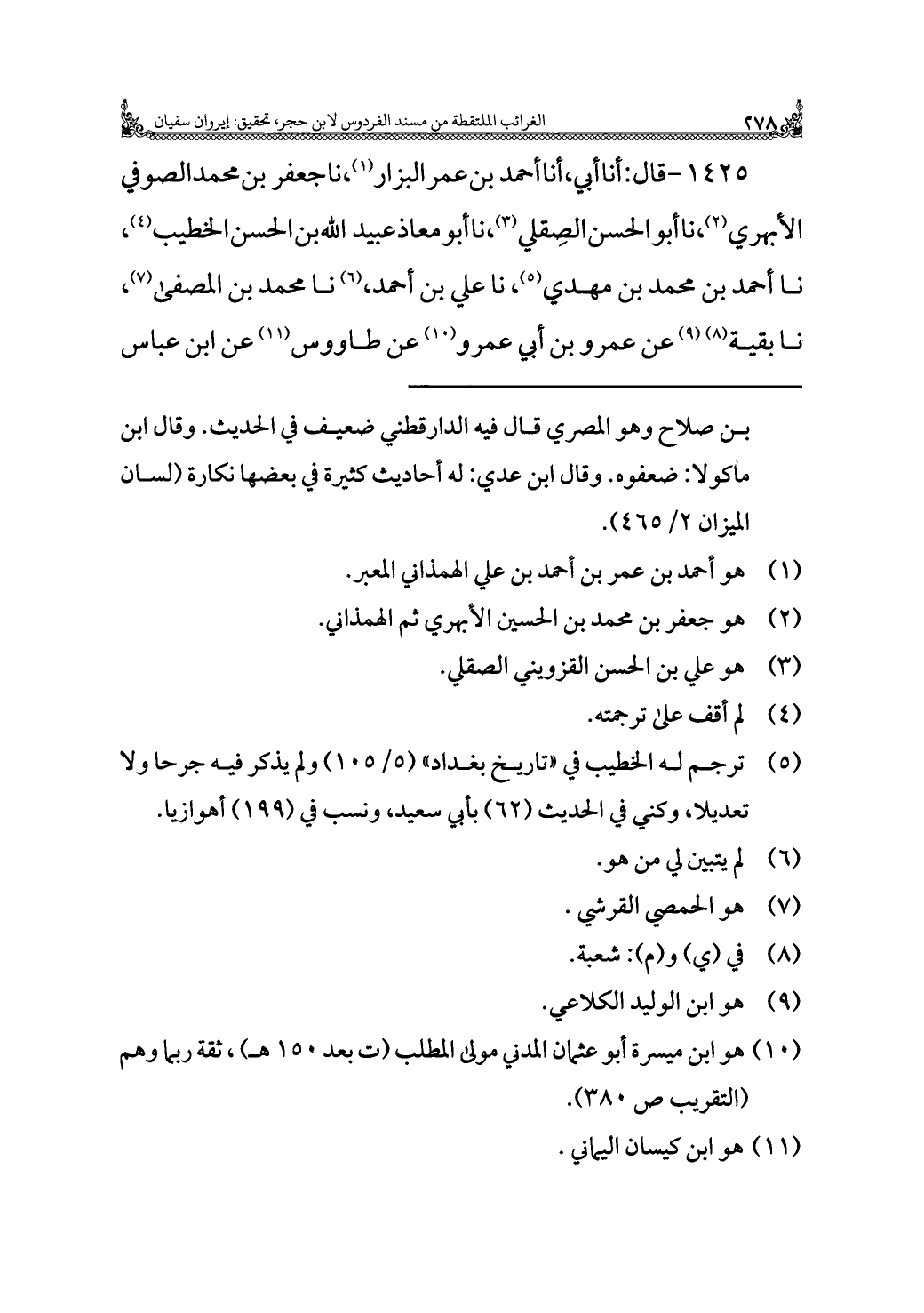 ١٤٢٥ - قال: أنا أبي، أنا أحمد بن عمر البزار (¬١)، نا جعفر بن محمد الصوفي الأبهري (¬٢)، نا أبو الحسن الصِقلي (¬٣)، نا أبو معاذ عبيد الله بن الحسن الخطيب (¬٤)، نا أحمد بن محمد بن مهدي (¬٥)، نا علي بن أحمد، (¬٦) نا محمد بن المصفى (¬٧)، نا بقية (¬٨) (¬٩) عن عمرو بن أبي عمرو (¬١٠) عن طاووس (¬١١) عن ابن عباس