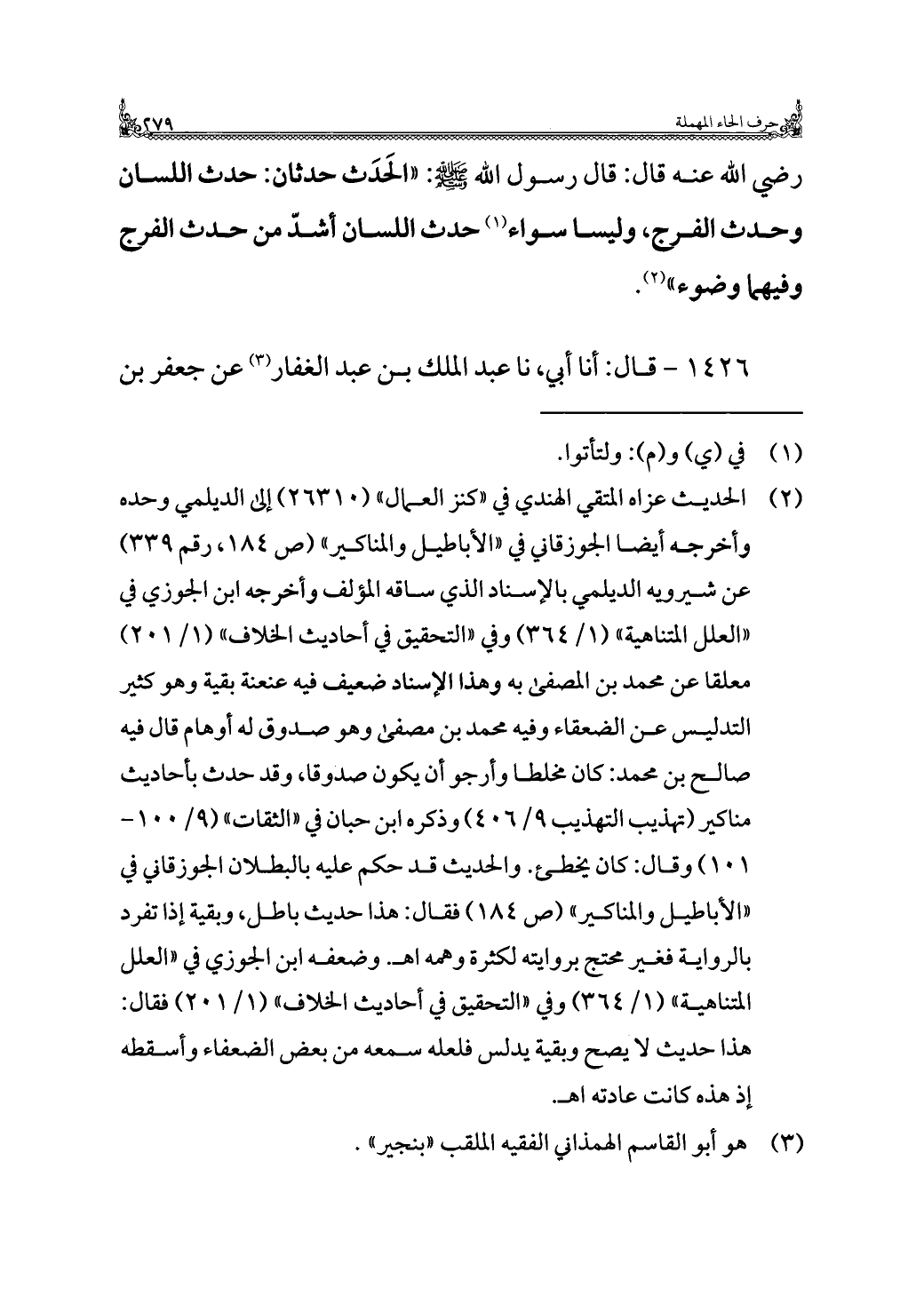 رضي الله عنه قال: قال رسول الله - صلى الله عليه وسلم -: "الحَدَث حدثان: حدث اللسان وحدث الفرج، وليسا سواء (¬١) حدث اللسان أشدّ من حدث الفرج وفيهما وضوء" (¬٢).