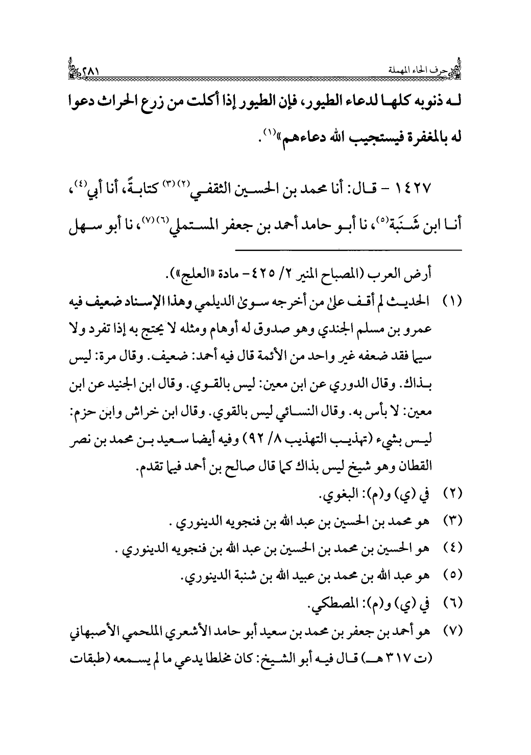 ١٤٢٧ - قال: أنا محمد بن الحسين الثقفي (¬٢) (¬٣) كتابةً، أنا أبي (¬٤)، أنا ابن شَنَبة (¬٥)، نا أبو حامد أحمد بن جعفر المستملي (¬٦) (¬٧)، نا أبو سهل