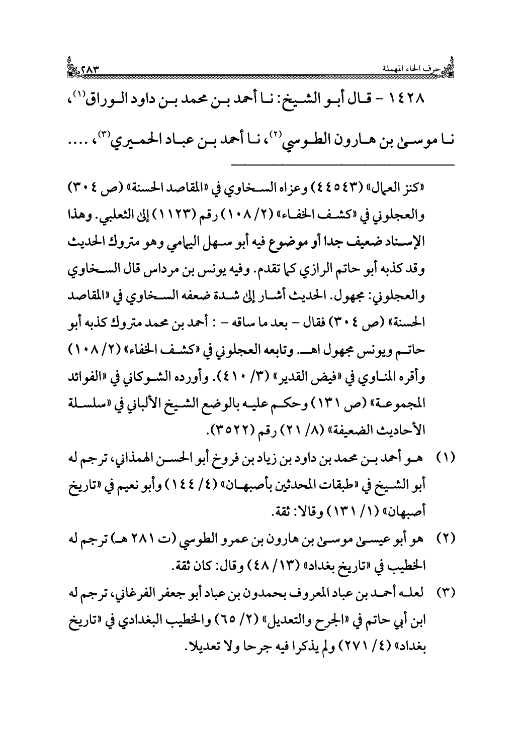 ١٤٢٨ - قال أبو الشيخ: نا أحمد بن محمد بن داود الوراق (¬١)، نا موسى بن هارون الطوسي (¬٢)، نا أحمد بن عباد الحميري (¬٣)، . . . .