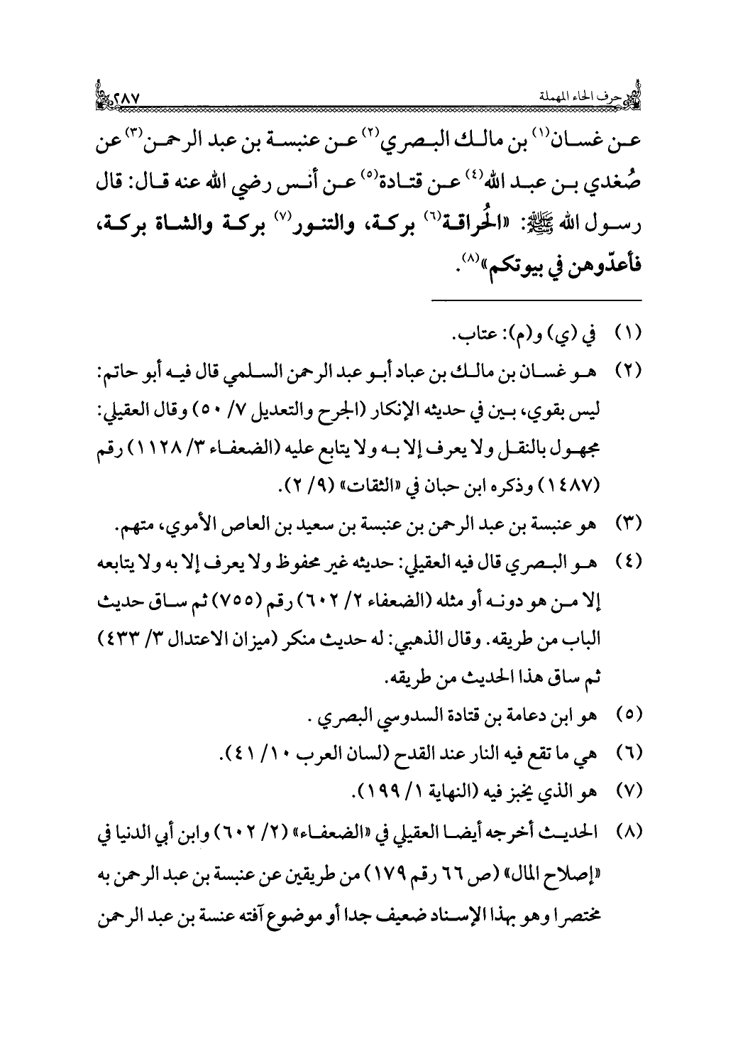 عن غسان (¬١) بن مالك البصري (¬٢) عن عنبسة بن عبد الرحمن (¬٣) عن صُغدي بن عبد الله (¬٤) عن قتادة (¬٥) عن أنس رضي الله عنه قال: قال رسول الله - صلى الله عليه وسلم -: "الحُراقة (¬٦) بركة، والتنور (¬٧) بركة والشاة بركة، فأعدّوهن في بيوتكم" (¬٨).