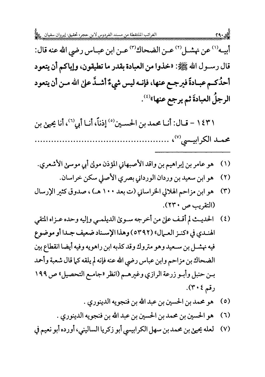 ١٤٣١ - قال: أنا محمد بن الحسين (¬٥) إذنًا، أنا أبي (¬٦)، أنا يحيى بن محمد الكرابيسي (¬٧)، . . . . . . . . . . . . . .