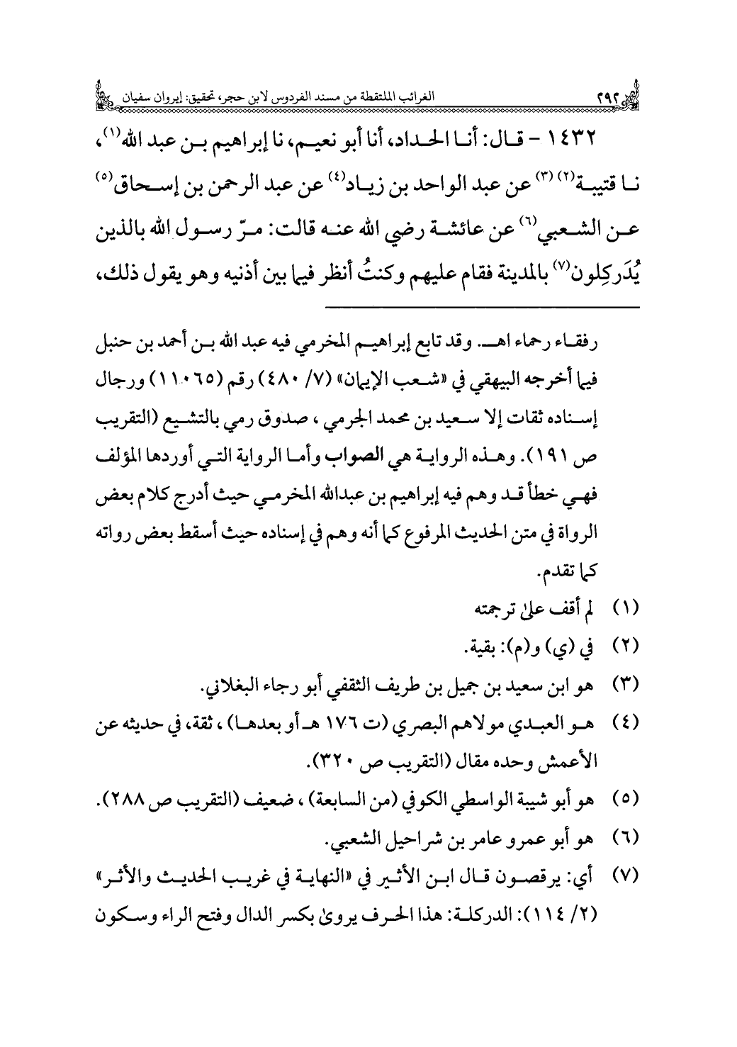 ١٤٣٢ - قال: أنا الحداد، أنا أبو نعيم، نا إبراهيم بن عبد الله (¬١)، نا قتيبة (¬٢) (¬٣) عن عبد الواحد بن زياد (¬٤) عن عبد الرحمن بن إسحاق (¬٥) عن الشعبي (¬٦) عن عائشة رضي الله عنها قالت: مرّ رسول الله بالذين يُدَركِلون (¬٧) بالمدينة فقام عليهم وكنتُ أنظر فيما بين أذنيه وهو يقول ذلك،
