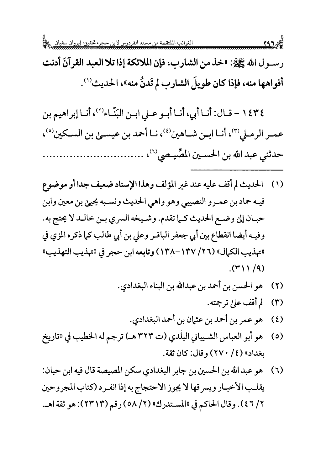 ١٤٣٤ - قال: أنا أبي، أنا أبو علي ابن البَنّاء (¬٢)، أنا إبراهيم بن عمر الرملي (¬٣)، أنا ابن شاهين (¬٤)، نا أحمد بن عيسى بن السكين (¬٥)، حدثني عبد الله بن الحسين المصِّيصي (¬٦)، . . . . . . . . . .