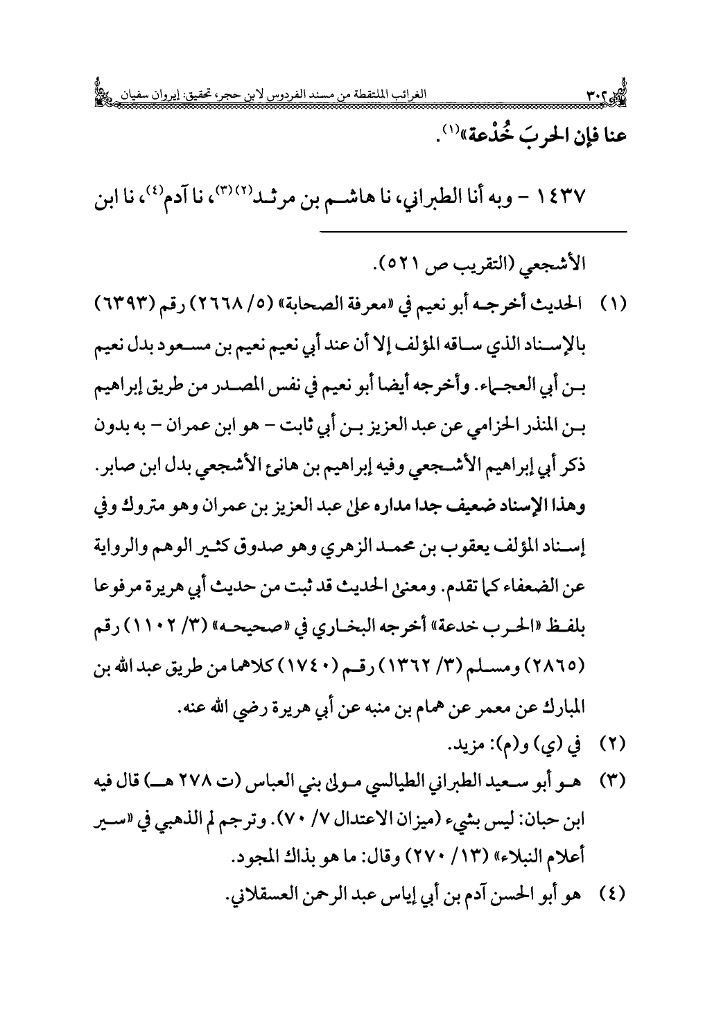 (¬١) الحديث أخرجه أبو نعيم في "معرفة الصحابة" (٥/ ٢٦٦٨) رقم (٦٣٩٣) بالإسناد الذي ساقه المؤلف إلا أن عند أبي نعيم نعيم بن مسعود بدل نعيم بن أبي العجماء. وأخرجه أيضًا أبو نعيم في نفس المصدر من طريق إبراهيم بن المنذر الحزامي عن عبد العزيز بن أبي ثابت - هو ابن عمران - به بدون ذكر أبي إبراهيم الأشجعي وفيه إبراهيم بن هانئ الأشجعي بدل ابن صابر. وهذا الإسناد ضعيف جدًا مداره على عبد العزيز بن عمران وهو متروك وفي إسناد المؤلف يعقوب بن محمد الزهري وهو صدوق كثير الوهم والرواية عن الضعفاء كما تقدم. ومعنى الحديث قد ثبت من حديث أبي هريرة مرفوعًا بلفظ "الحرب خدعة" أخرجه البخاري في "صحيحه" (٣/ ١١٠٢) رقم (٢٨٦٥) ومسلم (٣/ ١٣٦٢) رقم (١٧٤٠) كلاهما من طريق عبد الله بن المبارك عن معمر عن همام بن منبه عن أبي هريرة رضي الله عنه.