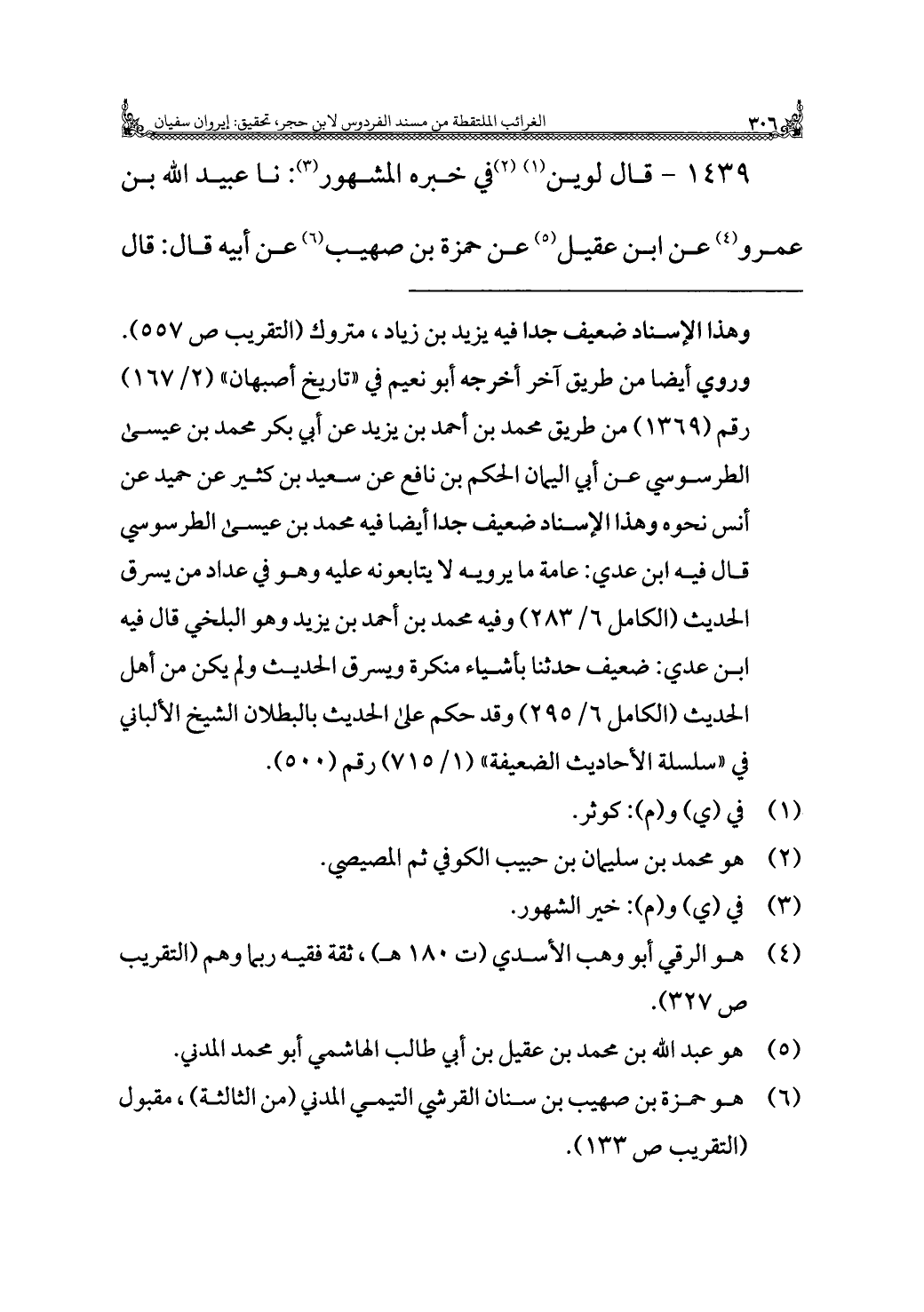 (¬٦) هو حمزة بن صهيب بن سنان القرشي التيمي المدني (من الثالثة)، مقبول (التقريب ص ١٣٣).