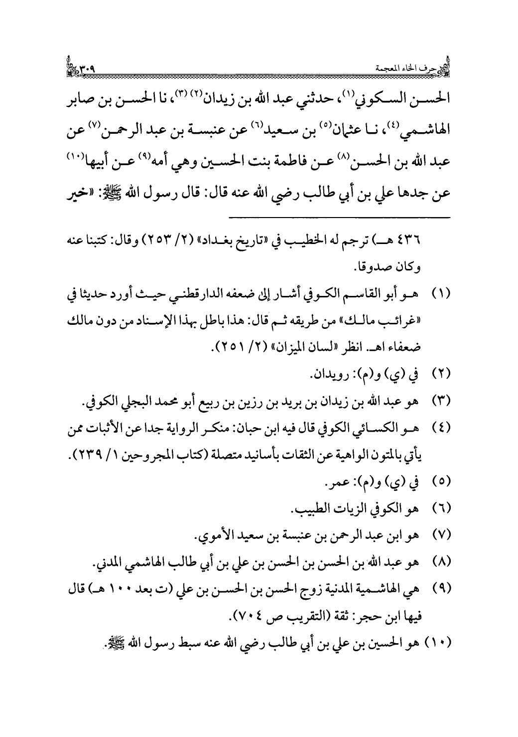(¬٩) هي الهاشمية المدنية زوج الحسن بن الحسن بن علي (ت بعد ١٠٠ هـ) قال فيها ابن حجر: ثقة (التقريب ص ٧٠٤).