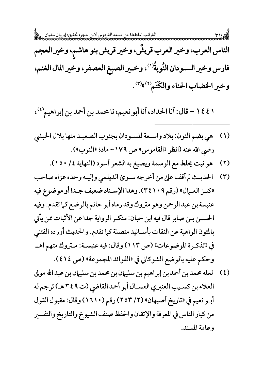 الناس العرب، وخير العرب قريشٌ، وخير قريش بنو هاشمٍ، وخير العجم فارس وخير السودان النُوبةُ (¬١)، وخير الصبغ العصفر، وخير المال الغنم، وخير الخضاب الحناء والكَتَم (¬٢) " (¬٣).
