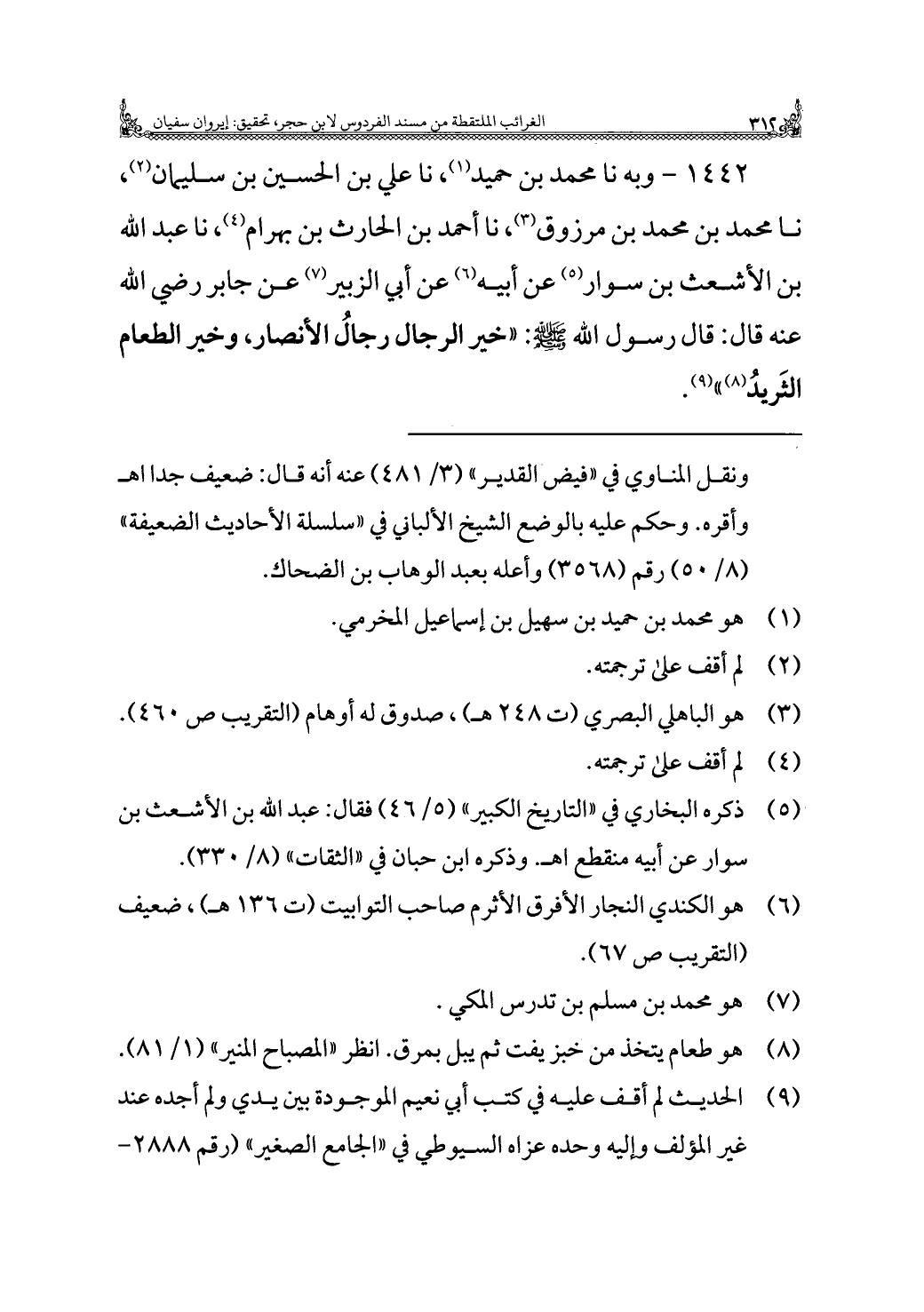 ١٤٤٢ - وبه نا محمد بن حميد (¬١)، نا علي بن الحسين بن سليمان (¬٢)، نا محمد بن محمد بن مرزوق (¬٣)، نا أحمد بن الحارث بن بهرام (¬٤)، نا عبد الله بن الأشعث بن سوار (¬٥) عن أبيه (¬٦) عن أبي الزبير (¬٧) عن جابر رضي الله عنه قال: قال رسول الله - صلى الله عليه وسلم -: "خير الرجال رجالُ الأنصار، وخير الطعام الثَريدُ (¬٨) " (¬٩).