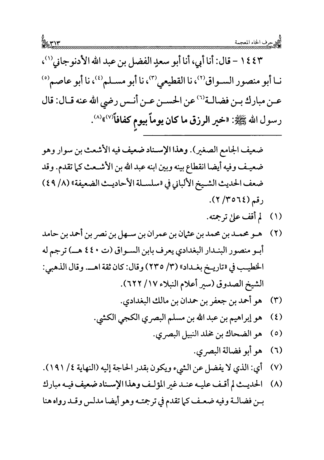 ١٤٤٣ - قال: أنا أبي، أنا أبو سعدٍ الفضل بن عبد الله الأدنوجاني (¬١)، نا أبو منصور السواق (¬٢)، نا القطيعي (¬٣)، نا أبو مسلم (¬٤)، نا أبو عاصم (¬٥) عن مبارك بن فضالة (¬٦) عن الحسن عن أنس رضي الله عنه قال: قال رسول الله - صلى الله عليه وسلم -: "خير الرزق ما كان يومًا بيومٍ كفافًا (¬٧) " (¬٨).