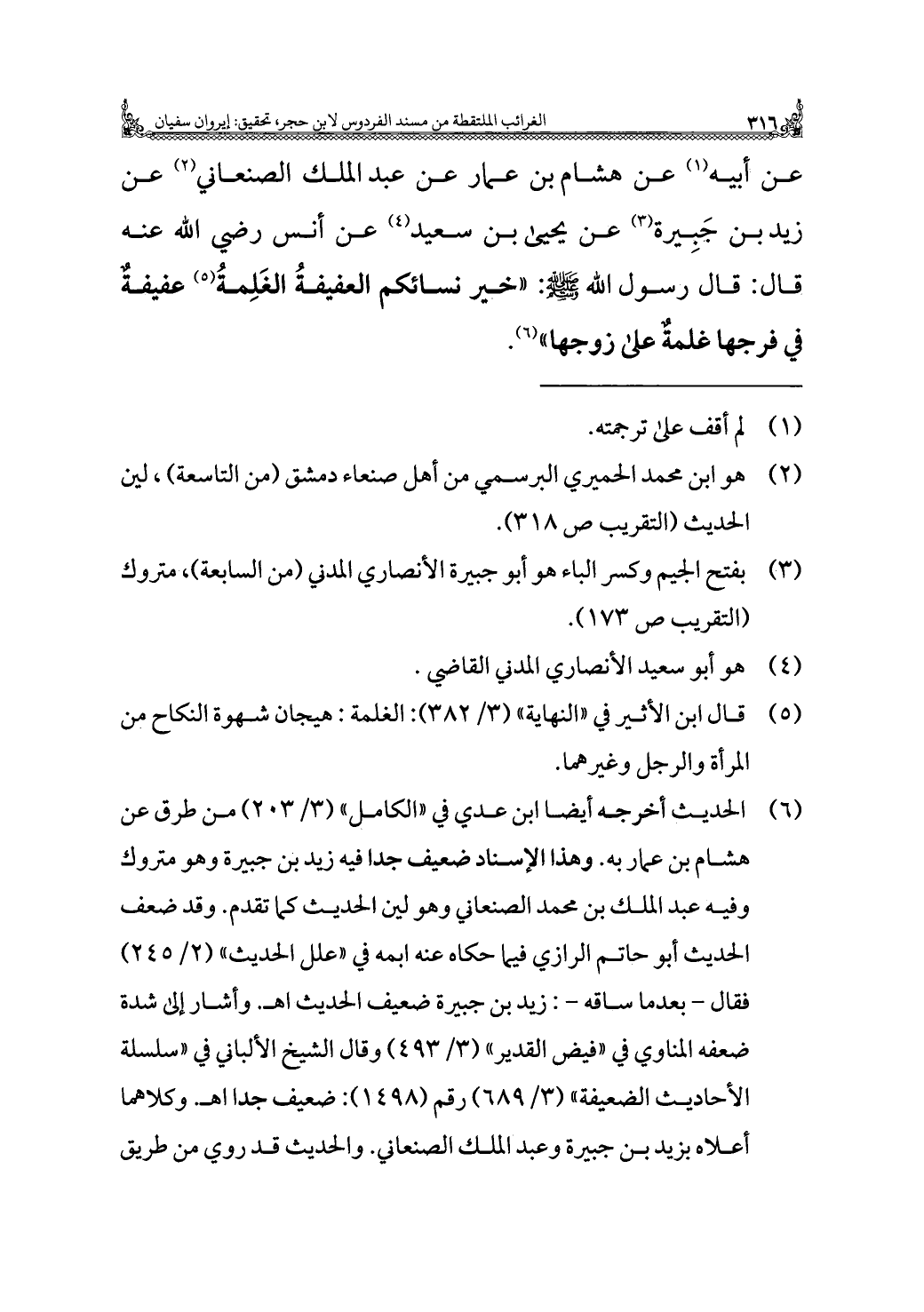 عن أبيه (¬١) عن هشام بن عمار عن عبد الملك الصنعاني (¬٢) عن زيد بن جَبِيرة (¬٣) عن يحيى بن سعيد (¬٤) عن أنس رضي الله عنه قال: قال رسول الله - صلى الله عليه وسلم -: "خير نسائكم العفيفةُ الغَلِمةُ (¬٥) عفيفةٌ في فرجها غلمةٌ على زوجها" (¬٦).