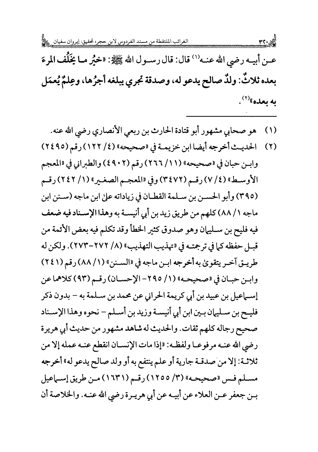 (¬٢) الحديث أخرجه أيضًا ابن خزيمة في "صحيحه" (٤/ ١٢٢) رقم (٢٤٩٥) وابن حبان في "صحيحه" (١١/ ٢٦٦) رقم (٤٩٠٢) والطبراني في "المعجم الأوسط" (٤/ ٧) رقم (٣٤٧٢) وفي "المعجم الصغير" (١/ ٢٤٢) رقم (٣٩٥) وأبو الحسن بن سلمة القطان في زياداته على ابن ماجه (سنن ابن ماجه ١/ ٨٨) كلهم من طريق زيد بن أبي أنيسة به وهذا الإسناد فيه ضعف فيه فليح بن سليمان وهو صدوق كثير الخطأ وقد تكلم فيه بعض الأئمة من قبل حفظه كما في ترجمته في "تهذيب التهذيب" (٨/ ٢٧٢ - ٢٧٣). ولكن له طريق آخر يتقوى به أخرجه ابن ماجه في "السنن" (١/ ٨٨) رقم (٢٤١) وابن حبان في "صحيحه" (١/ ٢٩٥ - الإحسان) رقم (٩٣) كلاهما عن إسماعيل بن عبيد بن أبي كريمة الحراني عن محمد بن سلمة به - بدون ذكر فليح بن سليمان بين ابن أي أنيسة وزيد بن أسلم - نحوه وهذا الإسناد صحيح رجاله كلهم ثقات. والحديث له شاهد مشهور من حديث أبي هريرة رضي الله عنه مرفوعًا ولفظه: "إذا مات الإنسان انقطع عنه عمله إلا من ثلاثة: إلا من صدقة جارية أو علم ينتفع به أو ولد صالح يدعو له" أخرجه مسلم في "صحيحه" (٣/ ١٢٥٥) رقم (١٦٣١) من طريق إسماعيل بن جعفر عن العلاء عن أبيه عن أبي هريرة رضي الله عنه. والخلاصة أن =