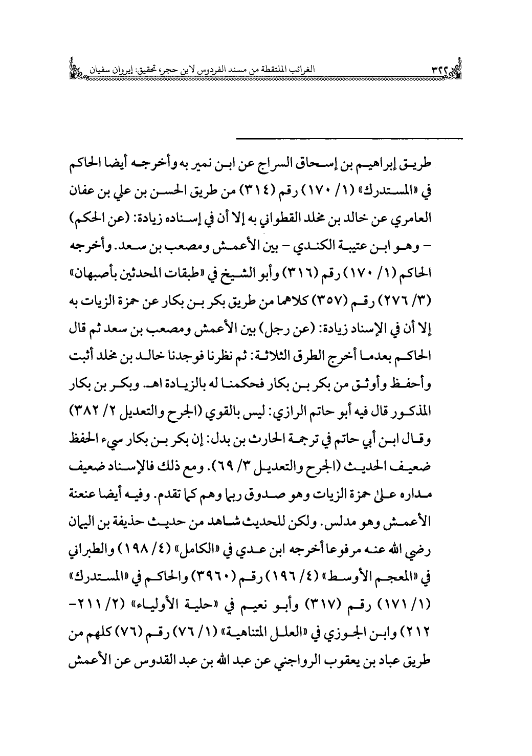= طريق إبراهيم بن إسحاق السراج عن ابن نمير به وأخرجه أيضًا الحاكم في "المستدرك" (١/ ١٧٠) رقم (٣١٤) من طريق الحسن بن علي بن عفان العامري عن خالد بن مخلد القطواني به إلا أن في إسناده زيادة: (عن الحكم) - وهو ابن عتيبة الكندي - بين الأعمش ومصعب بن سعد. وأخرجه الحاكم (١/ ١٧٠) رقم (٣١٦) وأبو الشيخ في "طبقات المحدثين بأصبهان" (٣/ ٢٧٦) رقم (٣٥٧) كلاهما من طريق بكر بن بكار عن حمزة الزيات به إلا أن في الإسناد زيادة: (عن رجل) بين الأعمش ومصعب بن سعد ثم قال الحاكم بعدما أخرج الطرق الثلاثة: ثم نظرنا فوجدنا خالد بن مخلد أثبت وأحفظ وأوثق من بكر بن بكار فحكمنا له بالزيادة اهـ. وبكر بن بكار المذكور قال فيه أبو حاتم الرازي: ليس بالقوي (الجرح والتعديل ٢/ ٣٨٢) وقال ابن أبي حاتم في ترجمة الحارث بن بدل: إن بكر بن بكار سيء الحفظ ضعيف الحديث (الجرح والتعديل ٣/ ٦٩). ومع ذلك فالإسناد ضعيف مداره على حمزة الزيات وهو صدوق ربما وهم كما تقدم. وفيه أيضًا عنعنة الأعمش وهو مدلس. ولكن للحديث شاهد من حديث حذيفة بن اليمان رضي الله عنه مرفوعًا أخرجه ابن عدي في "الكامل" (٤/ ١٩٨) والطبراني في "المعجم الأوسط" (٤/ ١٩٦) رقم (٣٩٦٠) والحاكم في "المستدرك" (١/ ١٧١) رقم (٣١٧) وأبو نعيم في "حلية الأولياء" (٢/ ٢١١ - ٢١٢) وابن الجوزي في "العلل المتناهية" (١/ ٧٦) رقم (٧٦) كلهم من طريق عباد بن يعقوب الرواجني عن عبد الله بن عبد القدوس عن الأعمش =