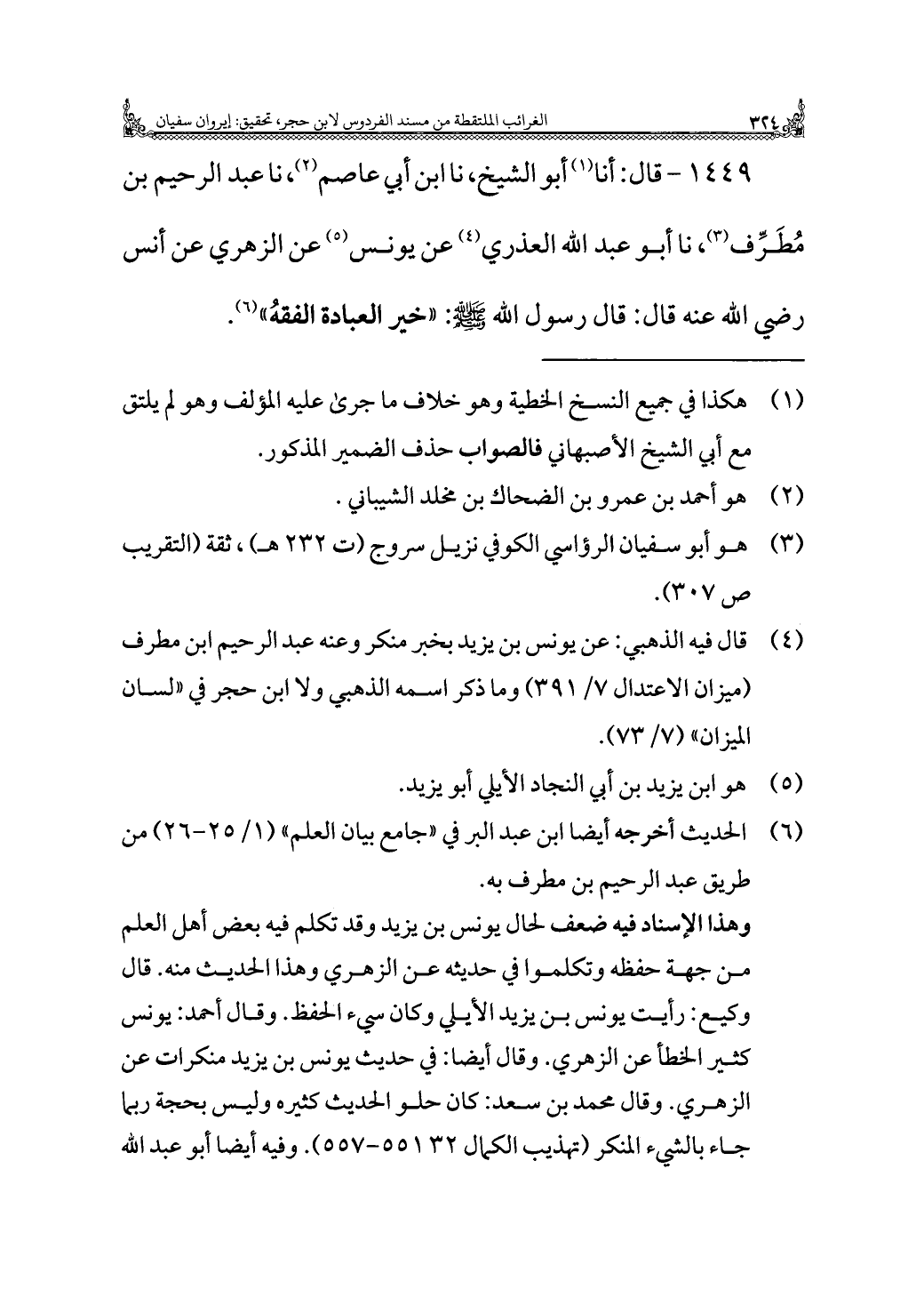 ١٤٤٩ - قال: أنا (¬١) أبو الشيخ، نا ابن أبي عاصم (¬٢)، نا عبد الرحيم بن مُطَرِّف (¬٣)، نا أبو عبد الله العذري (¬٤) عن يونس (¬٥) عن الزهري عن أنس رضي الله عنه قال: قال رسول الله - صلى الله عليه وسلم -: "خير العبادة الفقهُ" (¬٦).
