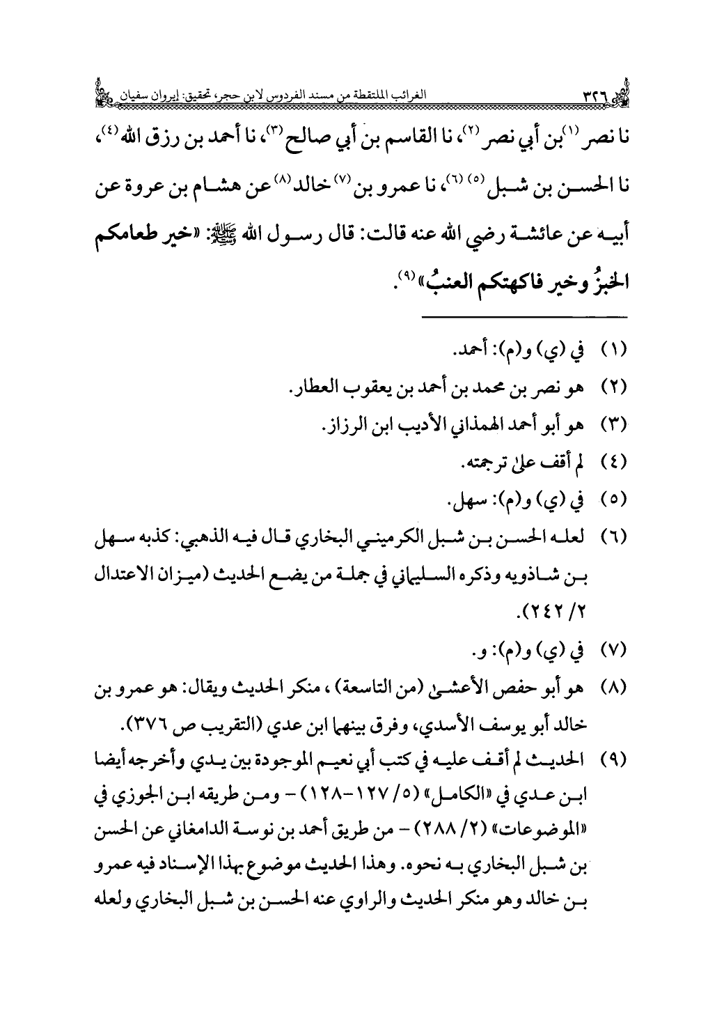 نا نصر (¬١) بن أبي نصر (¬٢)، نا القاسم بن أبي صالح (¬٣)، نا أحمد بن رزق الله (¬٤)، نا الحسن بن شبل (¬٥) (¬٦)، نا عمرو بن (¬٧) خالد (¬٨) عن هشام بن عروة عن أبيه عن عائشة رضي الله عنها قالت: قال رسول الله - صلى الله عليه وسلم -: "خير طعامكم الخبزُ وخير فاكهتكم العنبُ" (¬٩).