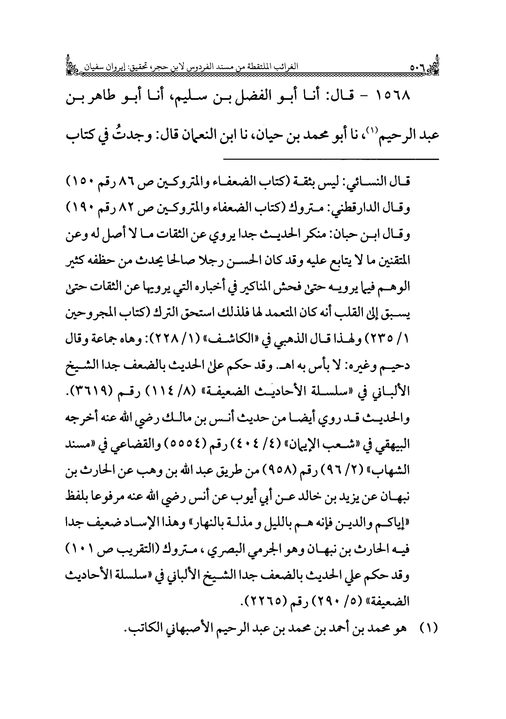 ١٥٦٨ - قال: أنا أبو الفضل بن سليم، أنا أبو طاهر بن عبد الرحيم (¬١)، نا أبو محمد بن حيان، نا ابن النعمان قال: وجدتُ في كتاب