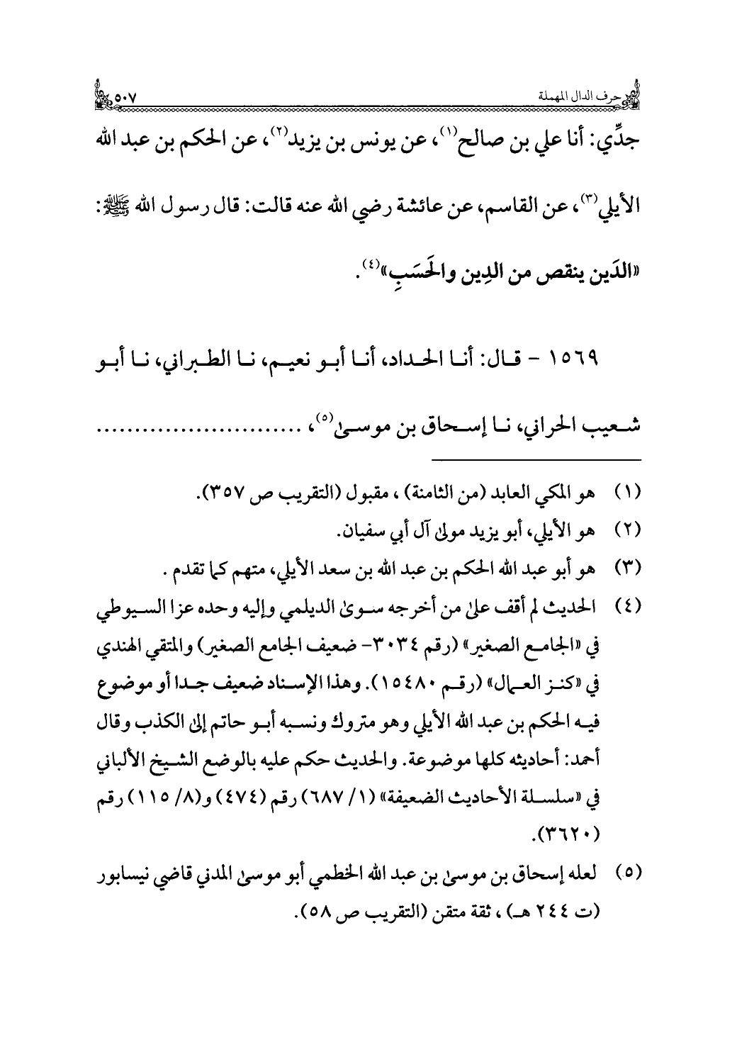جدِّي: أنا علي بن صالح (¬١)، عن يونس بن يزيد (¬٢)، عن الحكم بن عبد الله الأيلي (¬٣)، عن القاسم، عن عائشة رضي الله عنها قالت: قال رسول الله - صلى الله عليه وسلم -: "الدَين ينقص من الدِين والحَسَبِ" (¬٤)