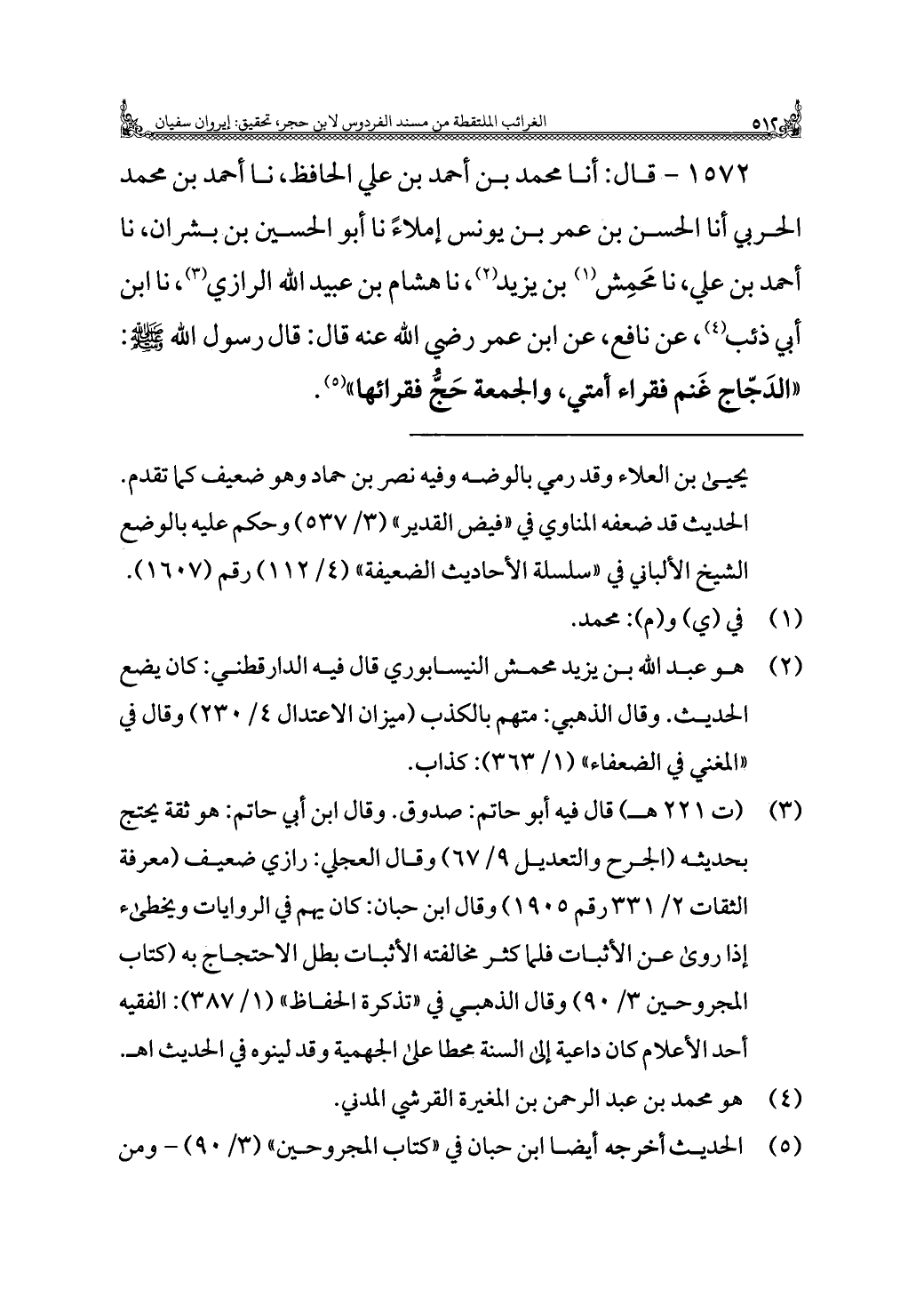 ١٥٧٢ - قال: أنا محمد بن أحمد بن علي الحافظ، نا أحمد بن محمد الحربي أنا الحسن بن عمر بن يونس إملاءً نا أبو الحسين بن بشران، نا أحمد بن علي، نا مَحمِش (¬١) بن يزيد (¬٢)، نا هشام بن عبيد الله الرازي (¬٣)، نا ابن أبي ذئب (¬٤)، عن نافع، عن ابن عمر رضي الله عنه قال: قال رسول الله - صلى الله عليه وسلم -: "الدَجّاج غَنم فقراء أمتي، والجمعة حَجُّ فقرائها" (¬٥).