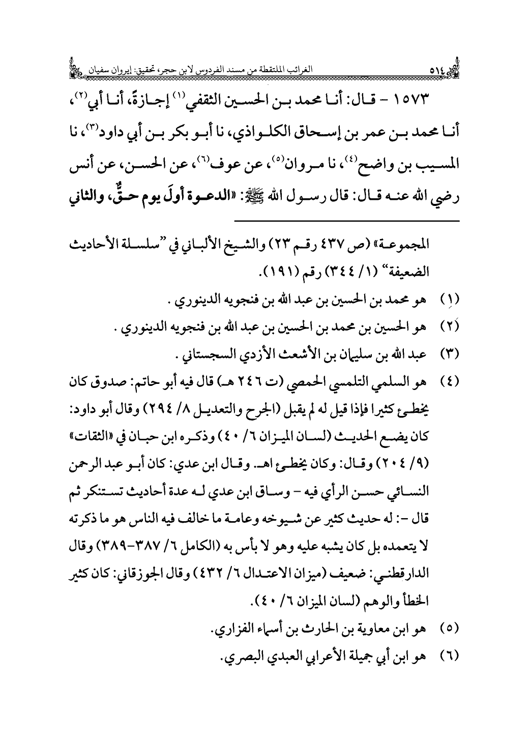 ١٥٧٣ - قال: أنا محمد بن الحسين الثقفي (¬١) إجازةً، أنا أبي (¬٢)، أنا محمد بن عمر بن إسحاق الكلواذي، نا أبو بكر بن أبي داود (¬٣)، نا المسيب بن واضح (¬٤)، نا مروان (¬٥)، عن عوف (¬٦)، عن الحسن، عن أنس رضي الله عنه قال: قال رسول الله - صلى الله عليه وسلم -: "الدعوة أولَ يوم حقٌّ، والثاني