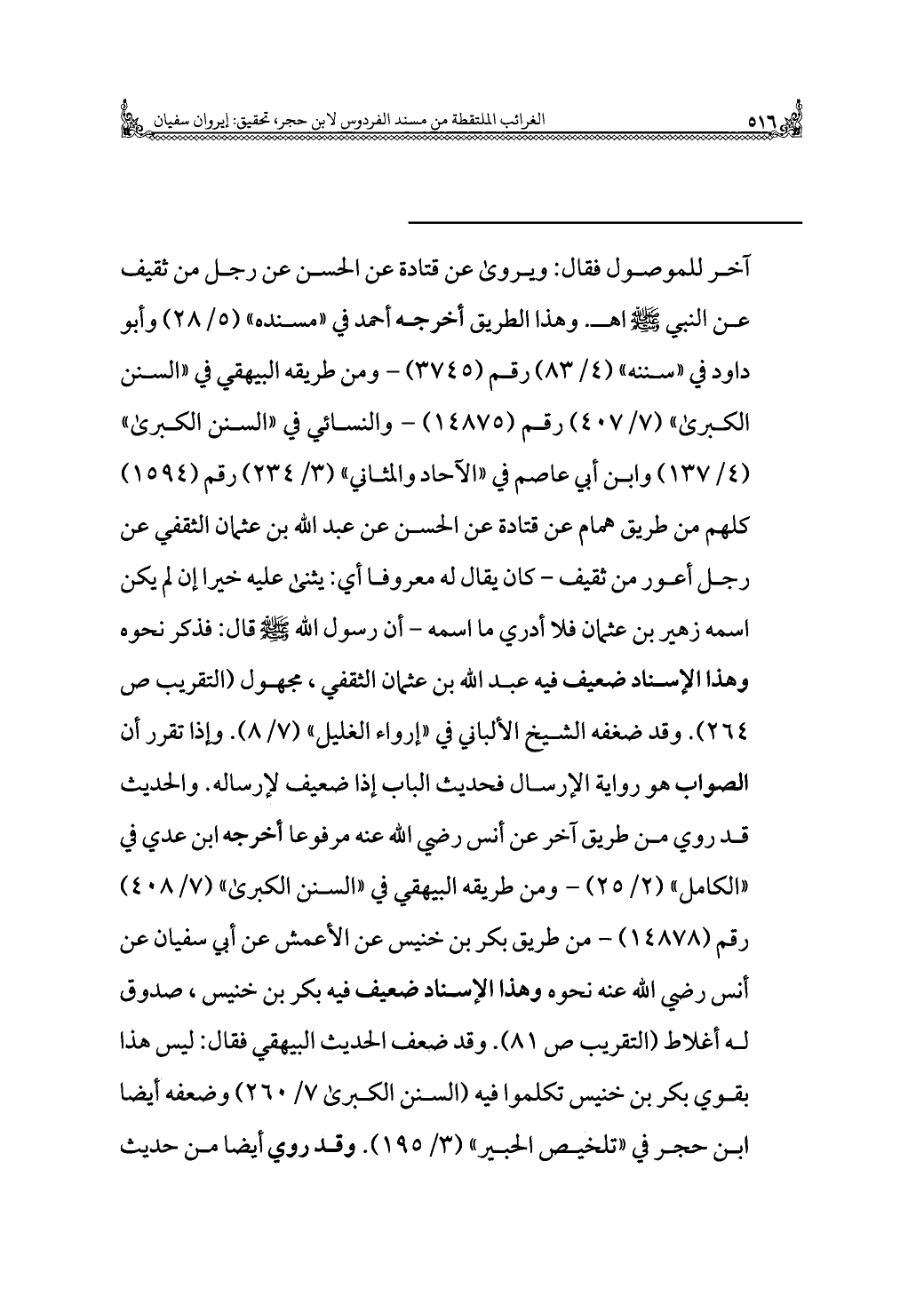 = آخر للموصول فقال: ويروى عن قتادة عن الحسن عن رجل من ثقيف عن النبي - صلى الله عليه وسلم - اهـ. وهذا الطريق أخرجه أحمد في "مسنده" (٥/ ٢٨) وأبو داود في "سننه" (٤/ ٨٣) رقم (٣٧٤٥) - ومن طريقه البيهقي في "السنن الكبرى" (٧/ ٤٠٧) رقم (١٤٨٧٥) - والنسائي في "السنن الكبرى" (٤/ ١٣٧) وابن أبي عاصم في "الآحاد والمثاني" (٣/ ٢٣٤) رقم (١٥٩٤) كلهم من طريق همام عن قتادة عن الحسن عن عبد الله بن عثمان الثقفي عن رجل أعور من ثقيف - كان يقال له معروفا أي: يثنى عليه خيرا إن لم يكن اسمه زهير بن عثمان فلا أدري ما اسمه - أن رسول الله - صلى الله عليه وسلم - قال: فذكر نحوه وهذا الإسناد ضعيف فيه عبد الله بن عثمان الثقفي، مجهول (التقريب ص ٢٦٤). وقد ضعفه الشيخ الألباني في "إرواء الغليل" (٧/ ٨). وإذا تقرر أن الصواب هو رواية الإرسال فحديث الباب إذا ضعيف لإرساله. والحديث قد روي من طريق آخر عن أنس رضي الله عنه مرفوعًا أخرجه ابن عدي في "الكامل" (٢/ ٢٥) - ومن طريقه البيهقي في "السنن الكبرى" (٧/ ٤٠٨) رقم (١٤٨٧٨) - من طريق بكر بن خنيس عن الأعمش عن أبي سفيان عن أنس رضي الله عنه نحوه وهذا الإسناد ضعيف فيه بكر بن خنيس، صدوق له أغلاط (التقريب ص ٨١). وقد ضعف الحديث البيهقي فقال: ليس هذا بقوي بكر بن خنيس تكلموا فيه (السنن الكبرى ٧/ ٢٦٠) وضعفه أيضًا ابن حجر في "تلخيص الحبير" (٣/ ١٩٥). وقد روي أيضًا من حديث =