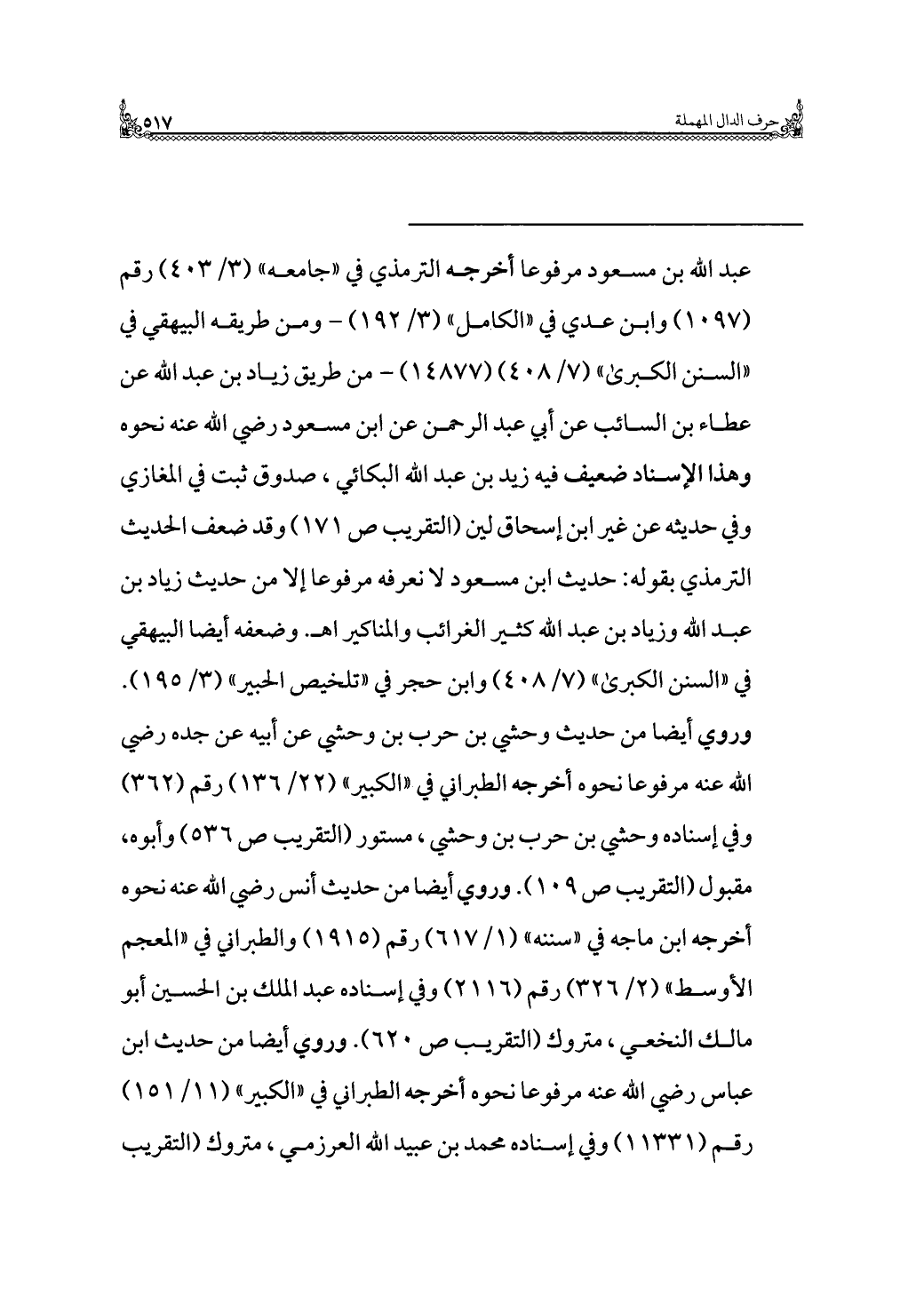 = عبد الله بن مسعود مرفوعًا أخرجه الترمذي في "جامعه" (٣/ ٤٠٣) رقم (١٠٩٧) وابن عدي في "الكامل" (٣/ ١٩٢) - ومن طريقه البيهقي في "السنن الكبرى" (٧/ ٤٠٨) (١٤٨٧٧) - من طريق زياد بن عبد الله عن عطاء بن السائب عن أبي عبد الرحمن عن ابن مسعود رضي الله عنه نحوه وهذا الإسناد ضعيف فيه زيد بن عبد الله البكائي، صدوق ثبت في المغازي وفي حديثه عن غير ابن إسحاق لين (التقريب ص ١٧١) وقد ضعف الحديث الترمذي بقوله: حديث ابن مسعود لا نعرفه مرفوعًا إلا من حديث زياد بن عبد الله وزياد بن عبد الله كثير الغرائب والمناكير اهـ. وضعفه أيضًا البيهقي في "السنن الكبرى" (٧/ ٤٠٨) وابن حجر في "تلخيص الحبير" (٣/ ١٩٥). وروي أيضًا من حديث وحشي بن حرب بن وحشي عن أبيه عن جده رضي الله عنه مرفوعًا نحوه أخرجه الطبراني في "الكبير" (٢٢/ ١٣٦) رقم (٣٦٢) وفي إسناده وحشي بن حرب بن وحشي، مستور (التقريب ص ٥٣٦) وأبوه، مقبول (التقريب ص ١٠٩). وروي أيضًا من حديث أنس رضي الله عنه نحوه أخرجه ابن ماجه في "سننه" (١/ ٦١٧) رقم (١٩١٥) والطبراني في "المعجم الأوسط" (٢/ ٣٢٦) رقم (٢١١٦) وفي إسناده عبد الملك بن الحسين أبو مالك النخعي، متروك (التقريب ص ٦٢٠). وروي أيضًا من حديث ابن عباس رضي الله عنه مرفوعًا نحوه أخرجه الطبراني في "الكبير" (١١/ ١٥١) رقم (١١٣٣١) وفي إسناده محمد بن عبيد الله العرزمي، متروك (التقريب =