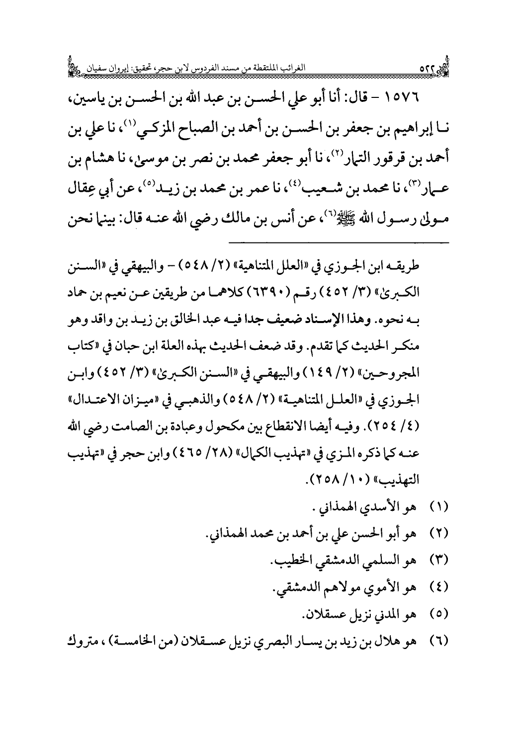 ١٥٧٦ - قال: أنا أبو علي الحسن بن عبد الله بن الحسن بن ياسين، نا إبراهيم بن جعفر بن الحسن بن أحمد بن الصباح المزكي (¬١)، نا علي بن أحمد بن قرقور التمار (¬٢)، نا أبو جعفر محمد بن نصر بن موسى، نا هشام بن عمار (¬٣)، نا محمد بن شعيب (¬٤)، نا عمر بن محمد بن زيد (¬٥)، عن أبي عِقال مولى رسول الله - صلى الله عليه وسلم - (¬٦)، عن أنس بن مالك رضي الله عنه قال: بينما نحن
