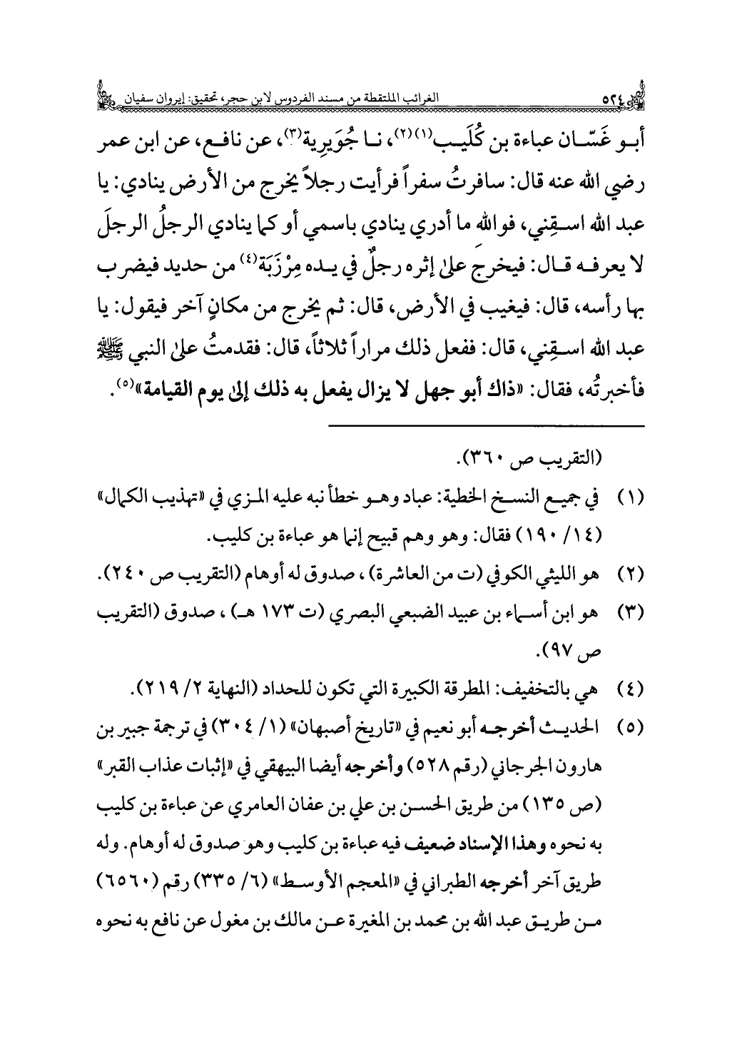 أبو غَسّان عباءة بن كُلَيب (¬١) (¬٢)، نا جُوَيرِية (¬٣)، عن نافع، عن ابن عمر رضي الله عنه قال: سافرتُ سفرًا فرأيت رجلًا يخرج من الأرض ينادي: يا عبد الله اسقِني، فواللهِ ما أدري ينادي باسمي أو كما بينادي الرجلُ الرجلَ لا يعرفه قال: فيخرج على إثره رجلٌ في يده مِرْزَبَة (¬٤) من حديد فيضرب بها رأسه، قال: فيغيب في الأرض، قال: ثم يخرج من مكانٍ آخر فيقول: يا عبد الله اسقِني، قال: ففعل ذلك مرارًا ثلاثًا، قال: فقدمتُ على النبي - صلى الله عليه وسلم - فأخبرتُه، فقال: "ذاك أبو جهل لا يزال يفعل به ذلك إلى يوم القيامة" (¬٥).